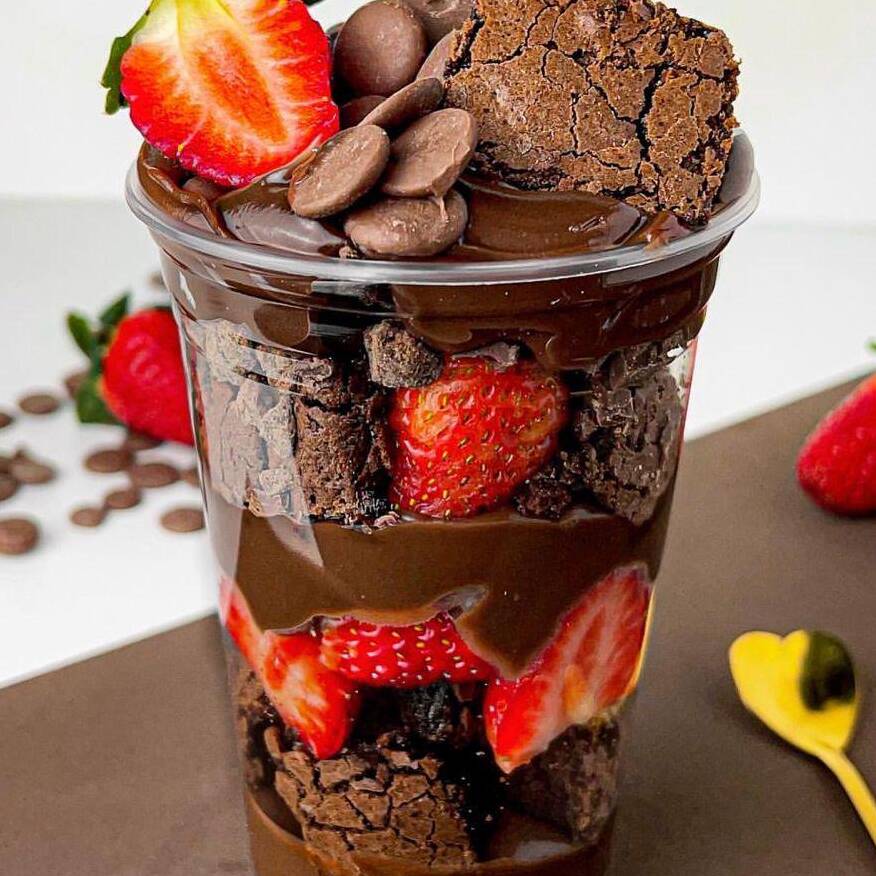 Crema de chocolate, brownie en trozos y fresas picadas.