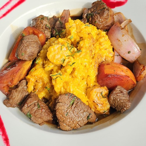 Arroz cremoso al ají amarillo con camarones, bañado en nuestro tradicional lomo saltado.