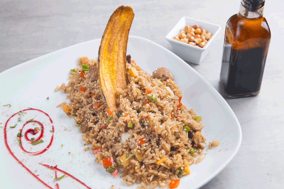 Riquísimo arroz fusión peruano oriental, con lomo fino, trozos de pollo y cerdo.