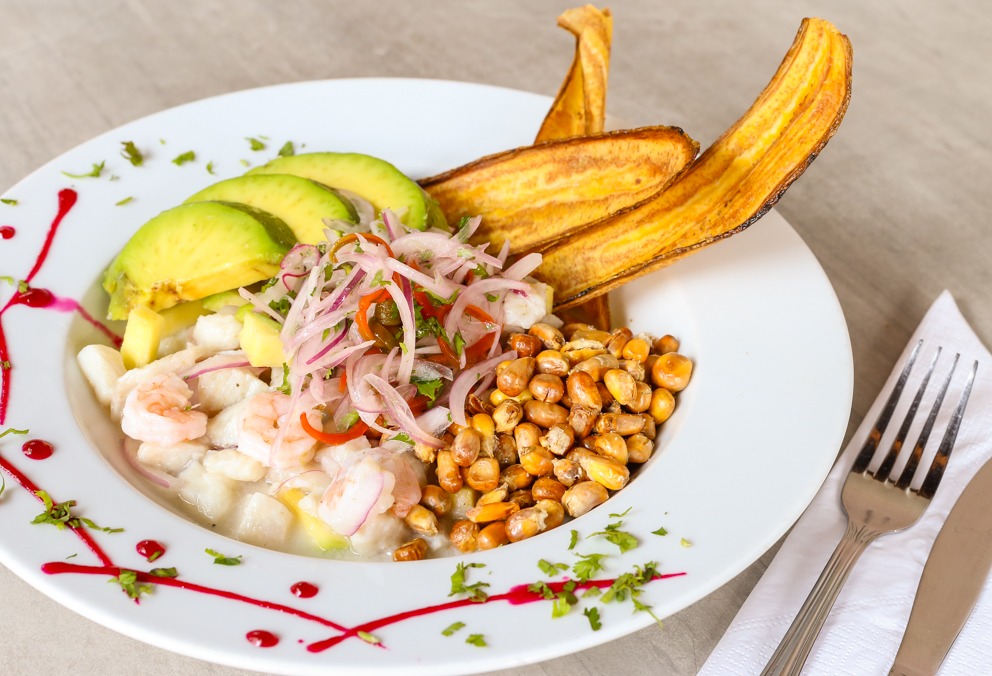 Trozos de pescado, camarón, marinados en fresco jugo de limón, cebolla, especias, cubitos de aguacate y mango biche.