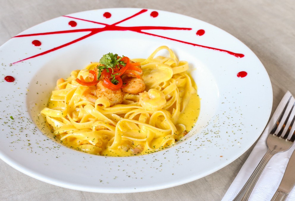 Pasta bañada en la tradicional salsa huancaína con frescos camarones ¡un suave picante!.