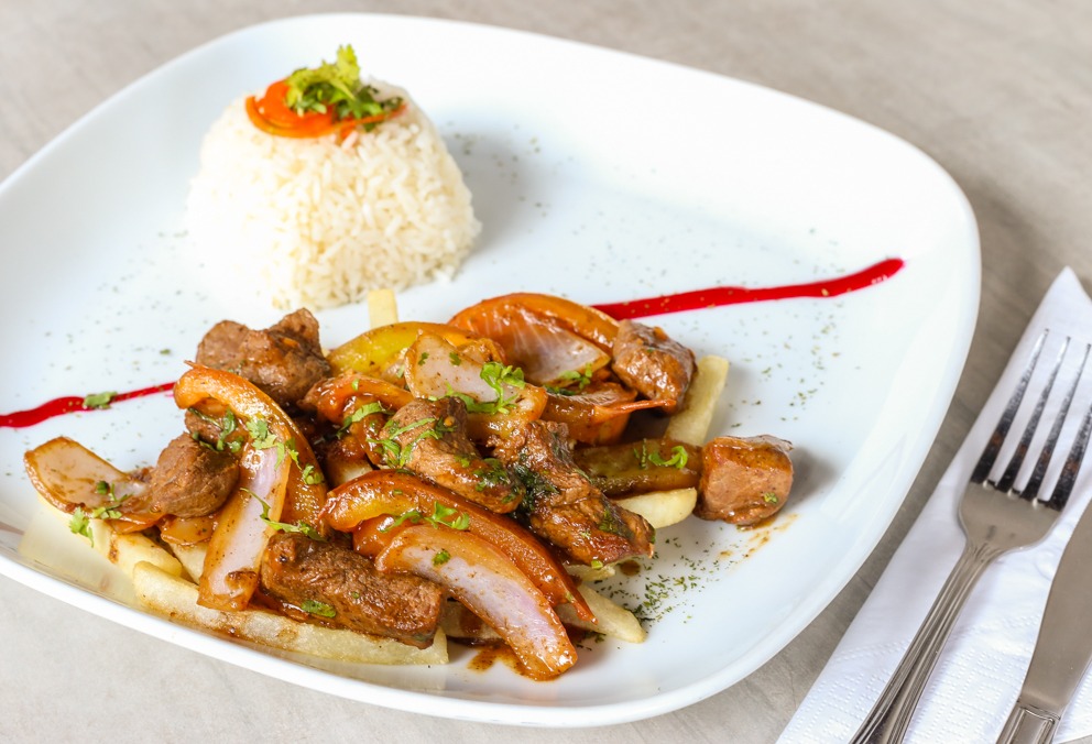 Trozos de solomito salteados al wok mezclados con cebolla, finas especias, tomates y papas a la francesa. Acompañado de arroz blanco.