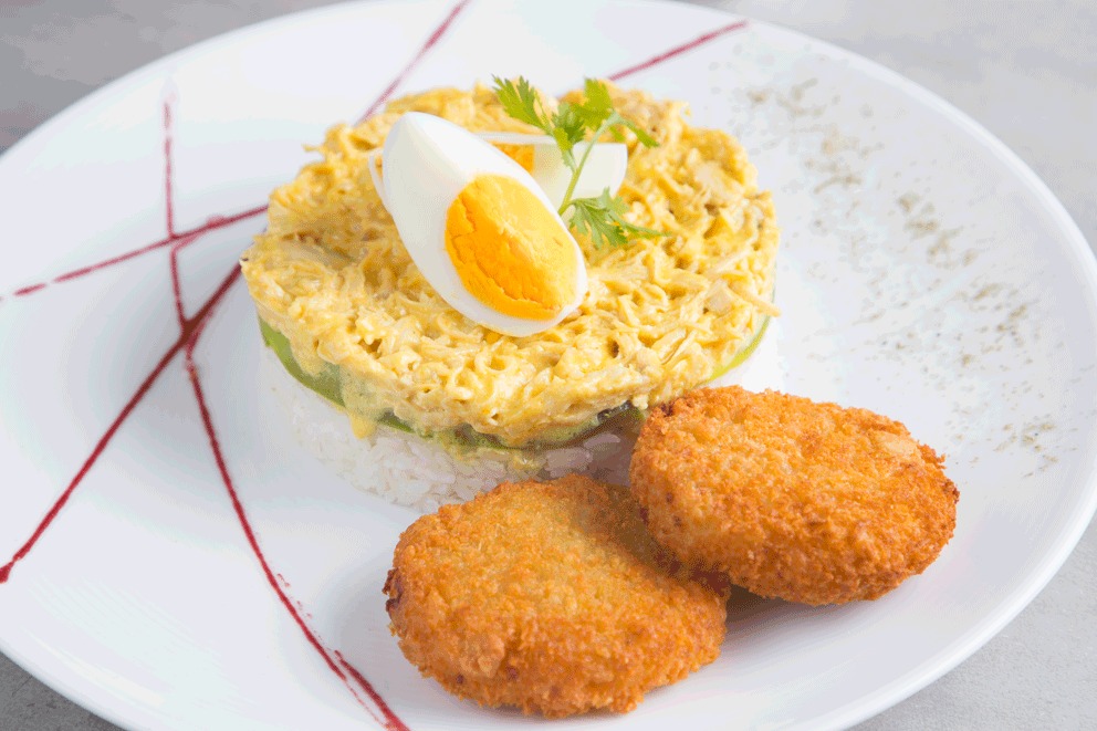 Pollo desmechado en salsa de ají amarillo fresco, servido sobre rodajas de papa y acompañado de arroz blanco (ligeramente picante).