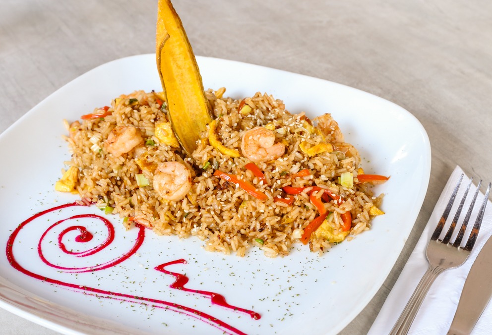 Provocativo arroz fusión peruano oriental, con salsa de soya, vegetales, trocitos de tortilla y un toque de ajonjolí, mezclado con frescos camarones.