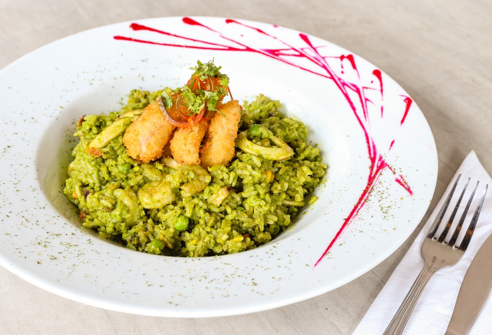 Exótico arroz con frescos camarones, pulpo y aros de calamar, a base de crema de cilantro y verduras.