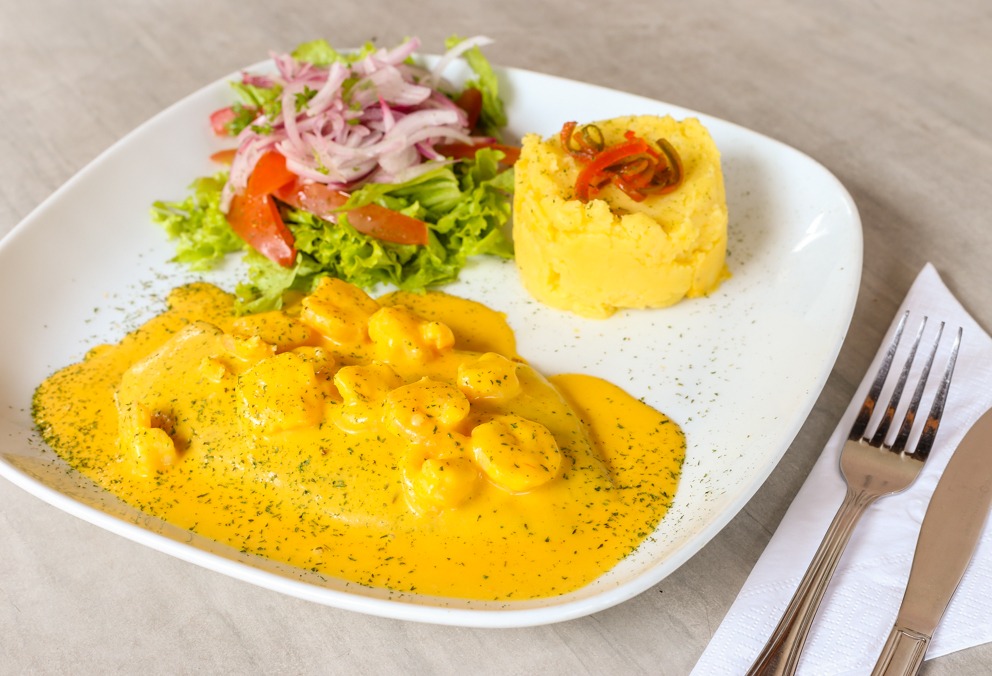 Selecto filete de pescado cubierto de suave salsa de ají amarillo fresco con camarones y crema de leche, acompañado de puré de papa y cascos de tomates.