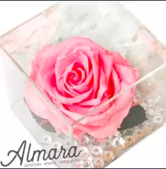 -1 Rosa natural preservada sin tallo rosada -1 Caja acrilica 9*9*9 cm -Decorada con diamantes imitación y cinta de tela