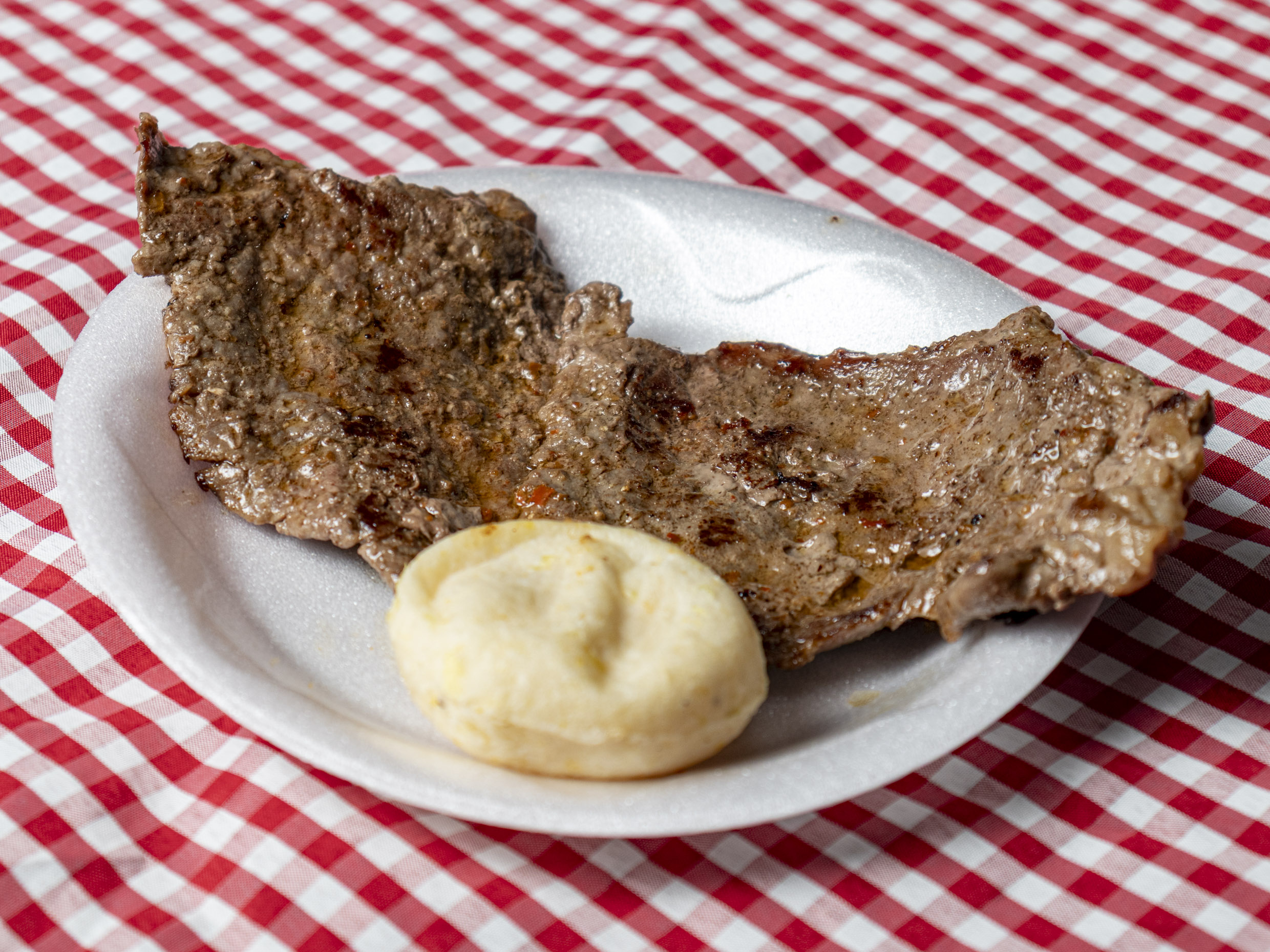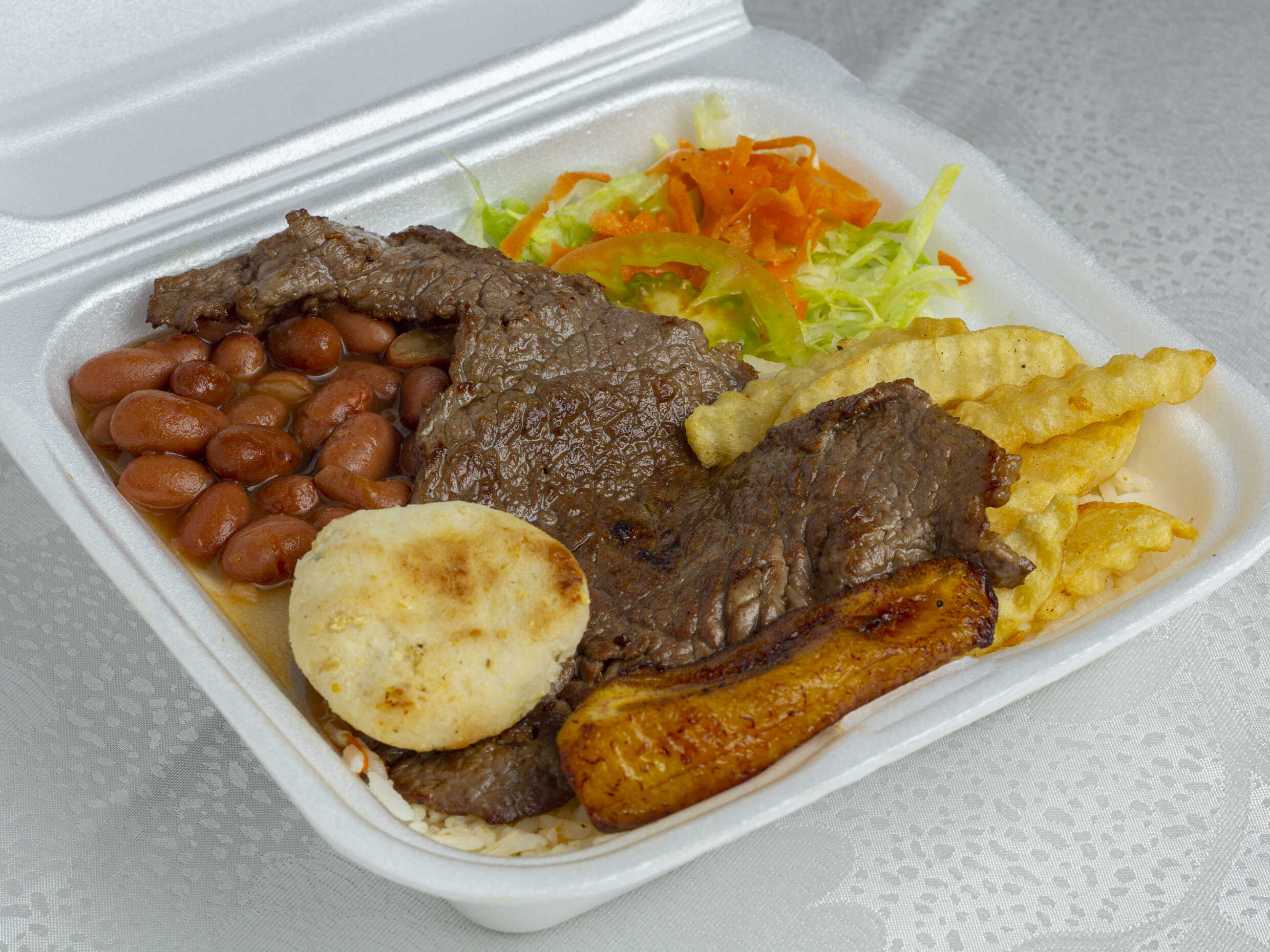 Ejecutivo con res asada de 110 g, arroz blanco, frijoles en la bandeja, ensalada de la casa, arepa asada y papas a la francesa. Incluye sopa del día 12 oz y jugo del día 12 oz.