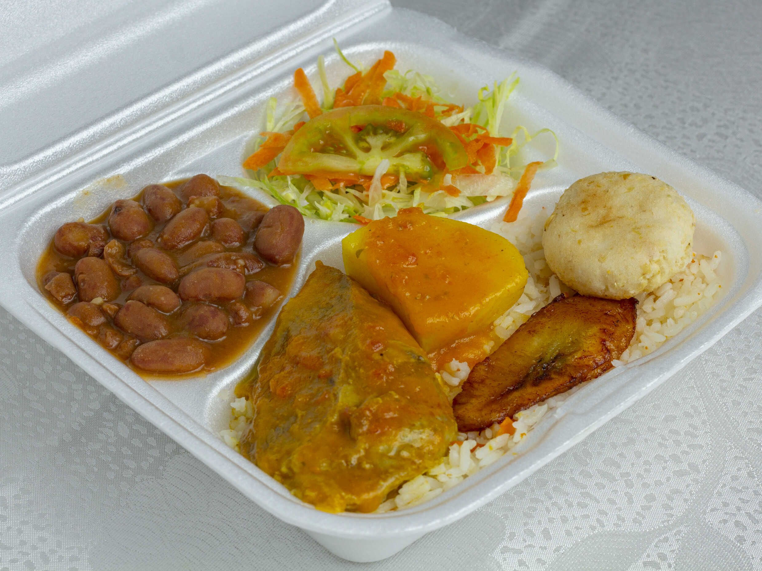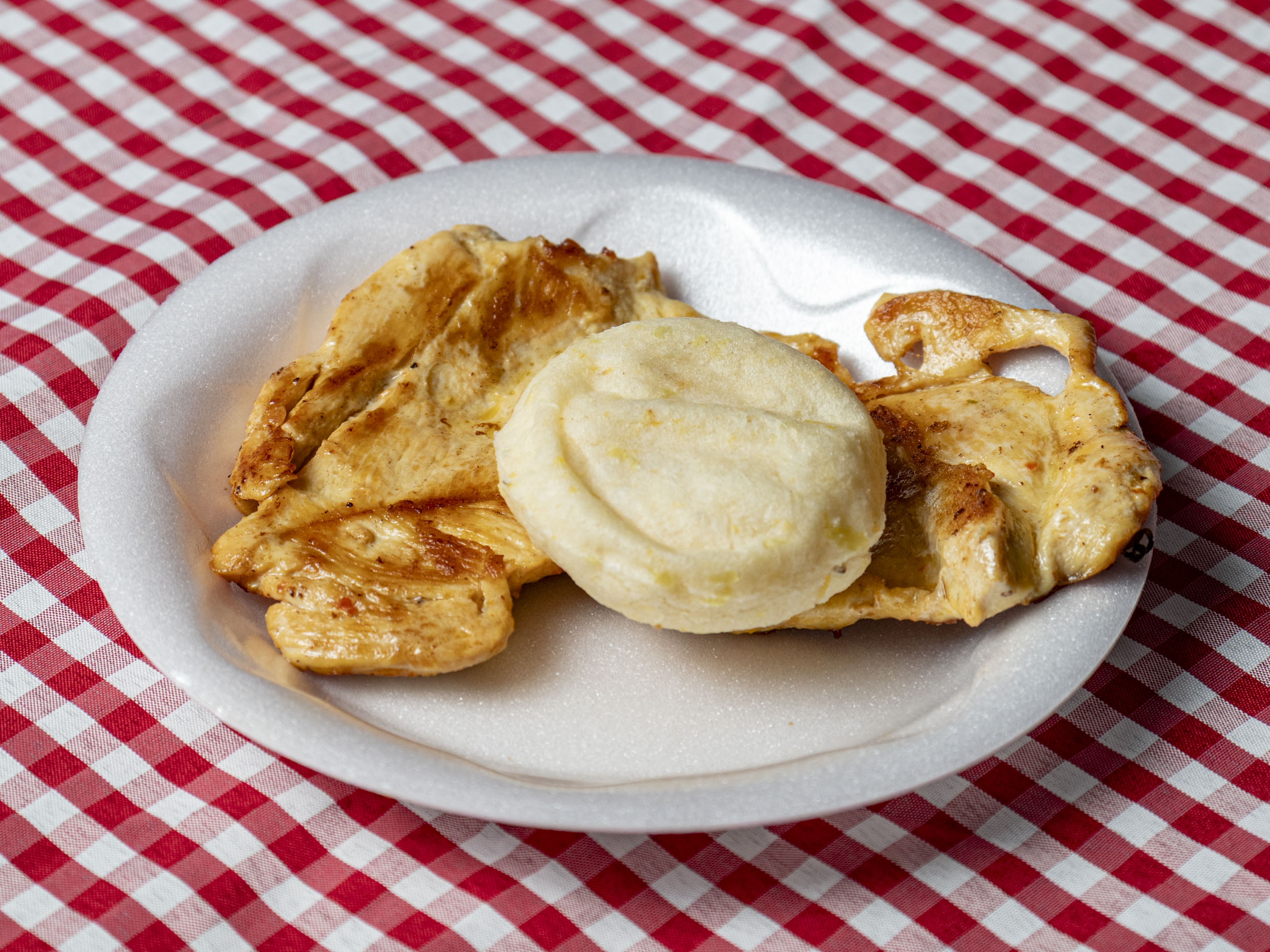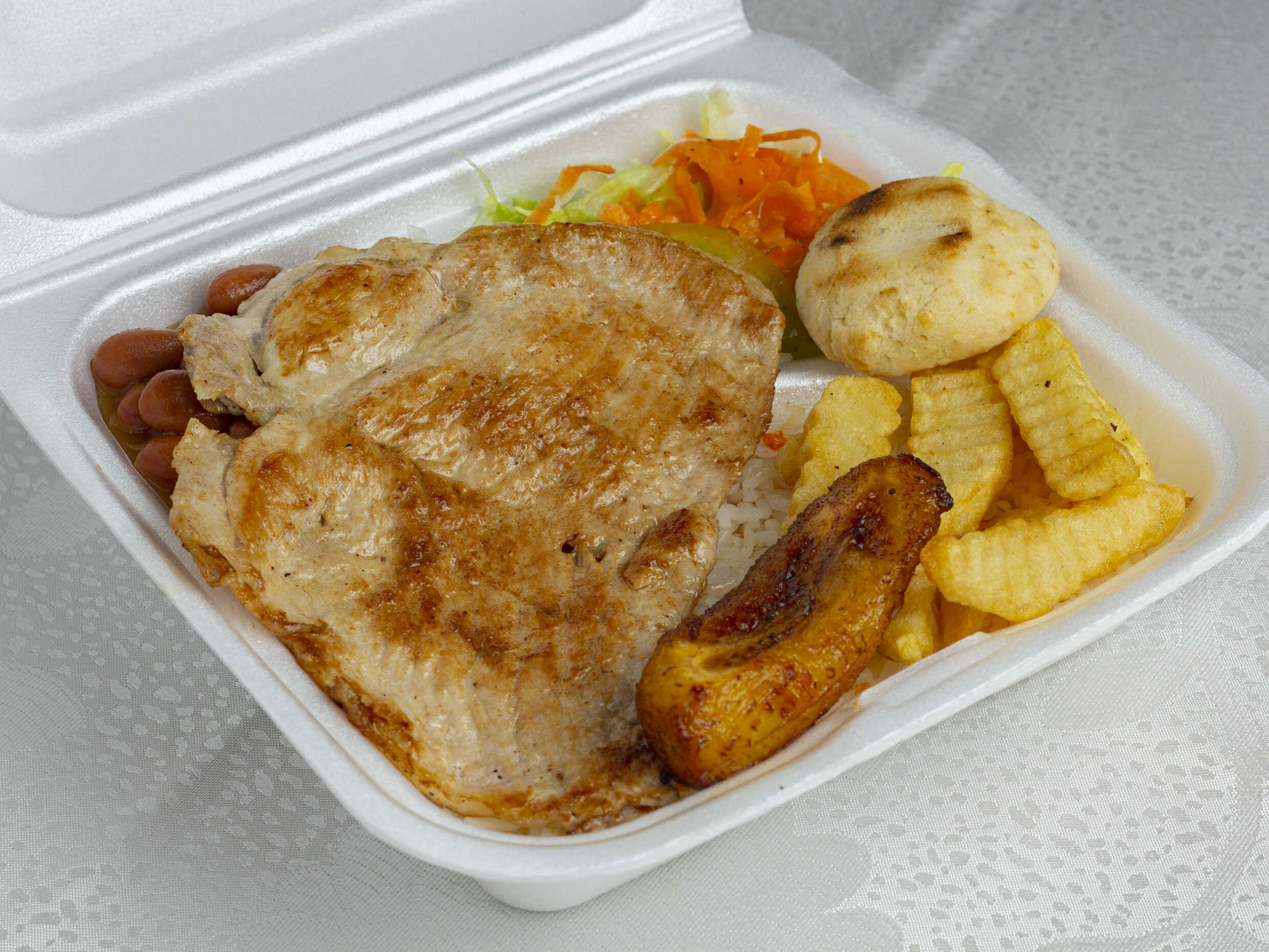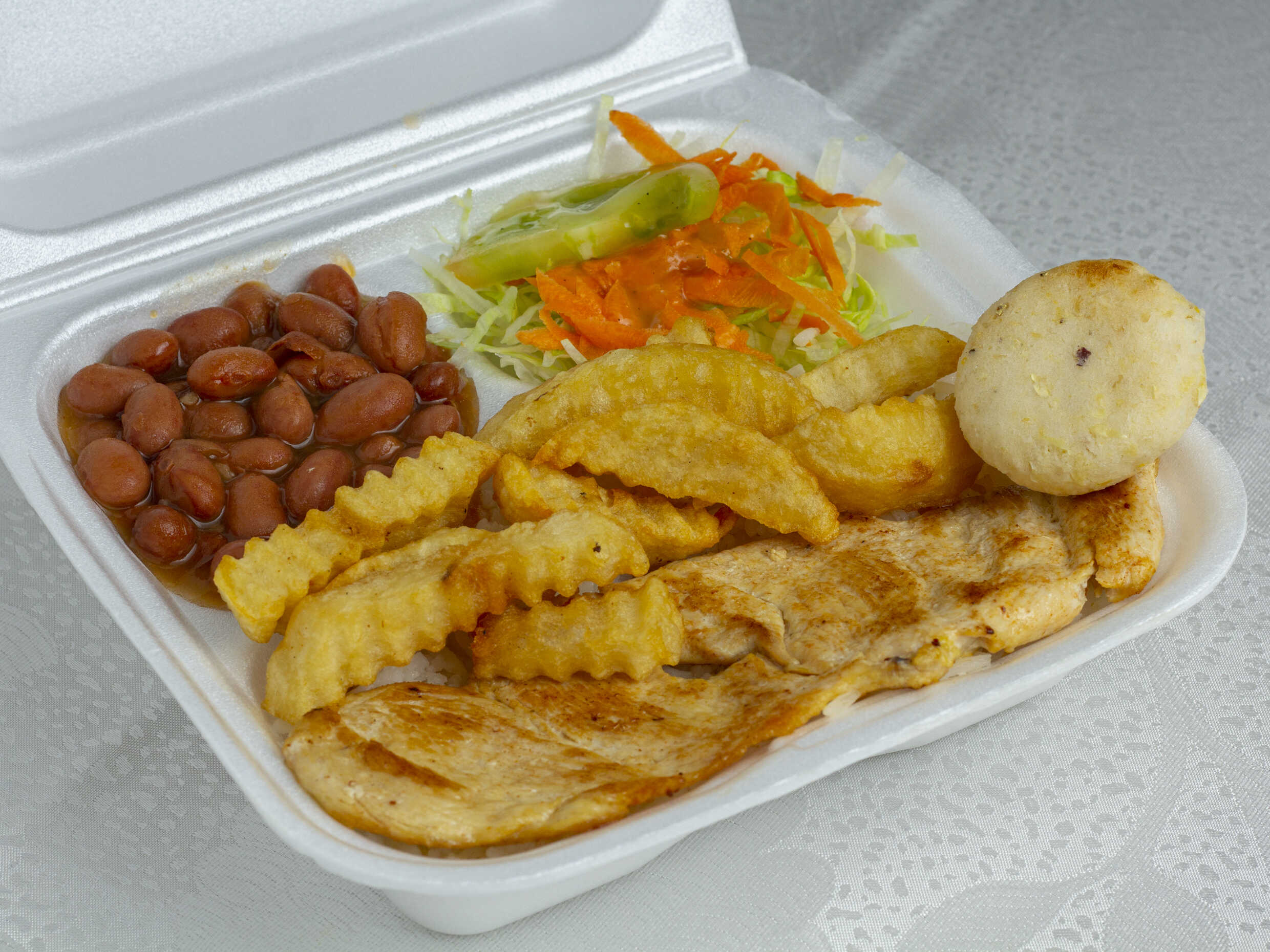Ejecutivo con pechuga asada de 110 g, arroz blanco, frijoles en la bandeja, ensalada de la casa, arepa pequeña y papas a la francesa. Incluye sopa del día 12 oz y jugo del día 12 oz.