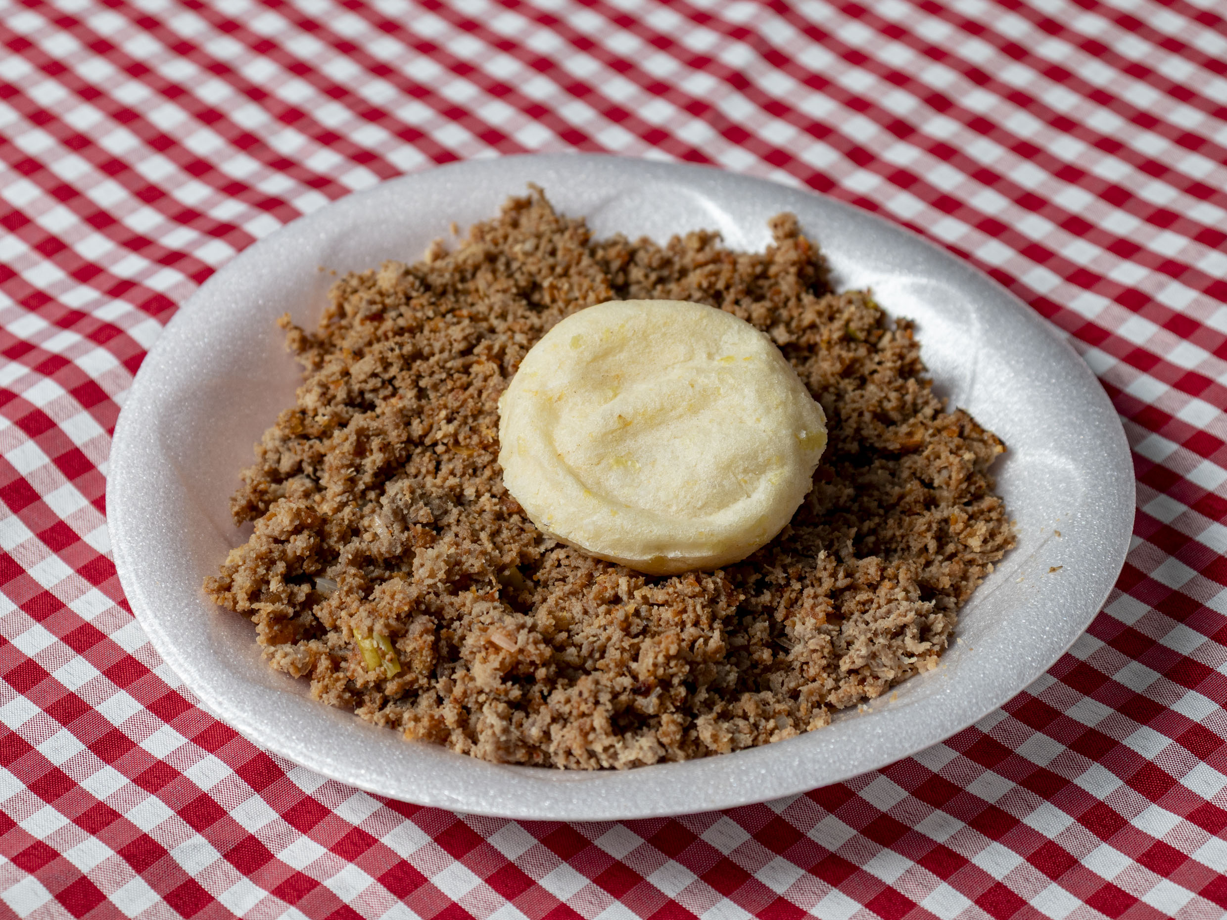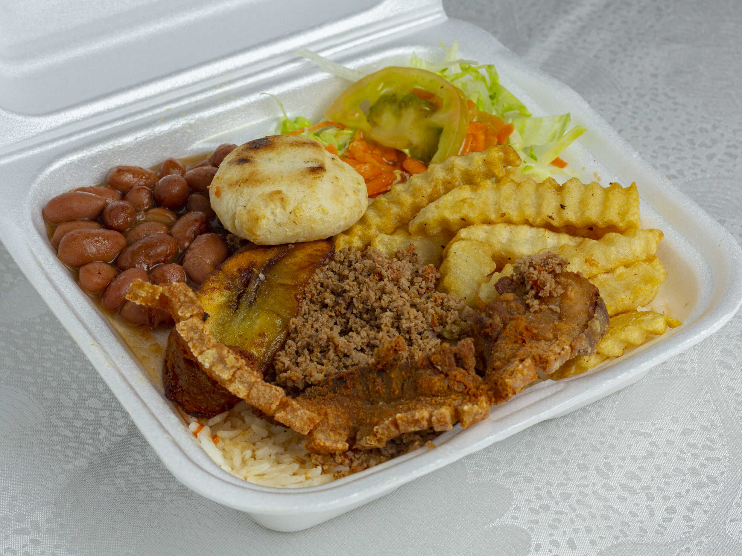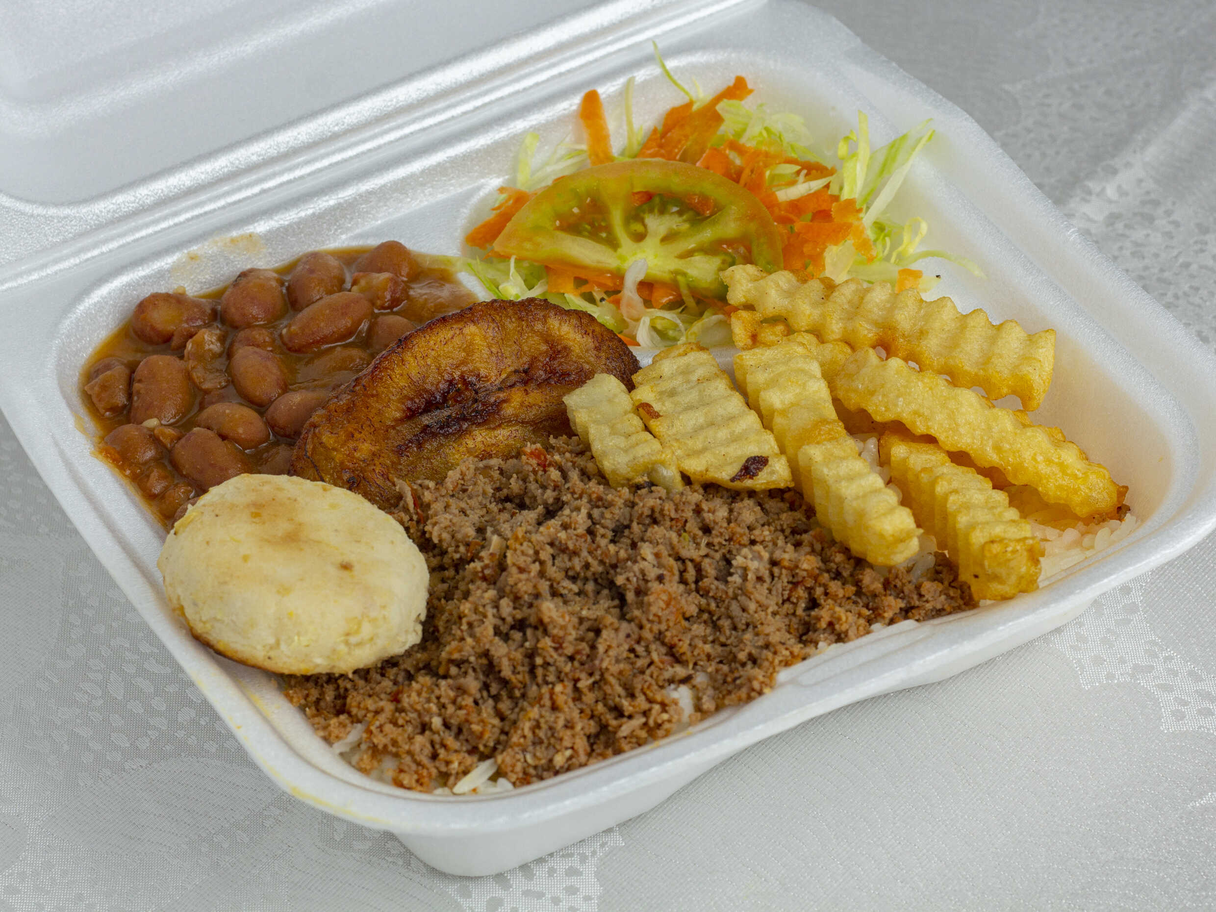 Ejecutivo con carne molida de res, arroz, frijoles en la bandeja, ensalada de la casa, arepa asada, papas a la francesas, acompañado de sopa del dia 12 onzas y jugo del dia 12 onzas.