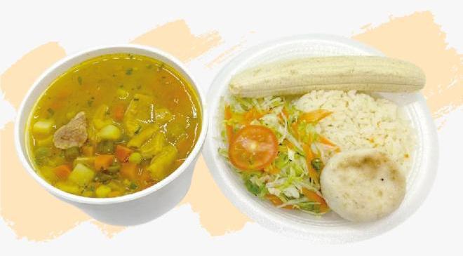 Mini bandeja paisa con frijoles, arroz blanco, carne molida, chicharrón, tajada de maduro y ensalada de la casa. Incluye sopa del día 12 oz y jugo del día 12 oz.