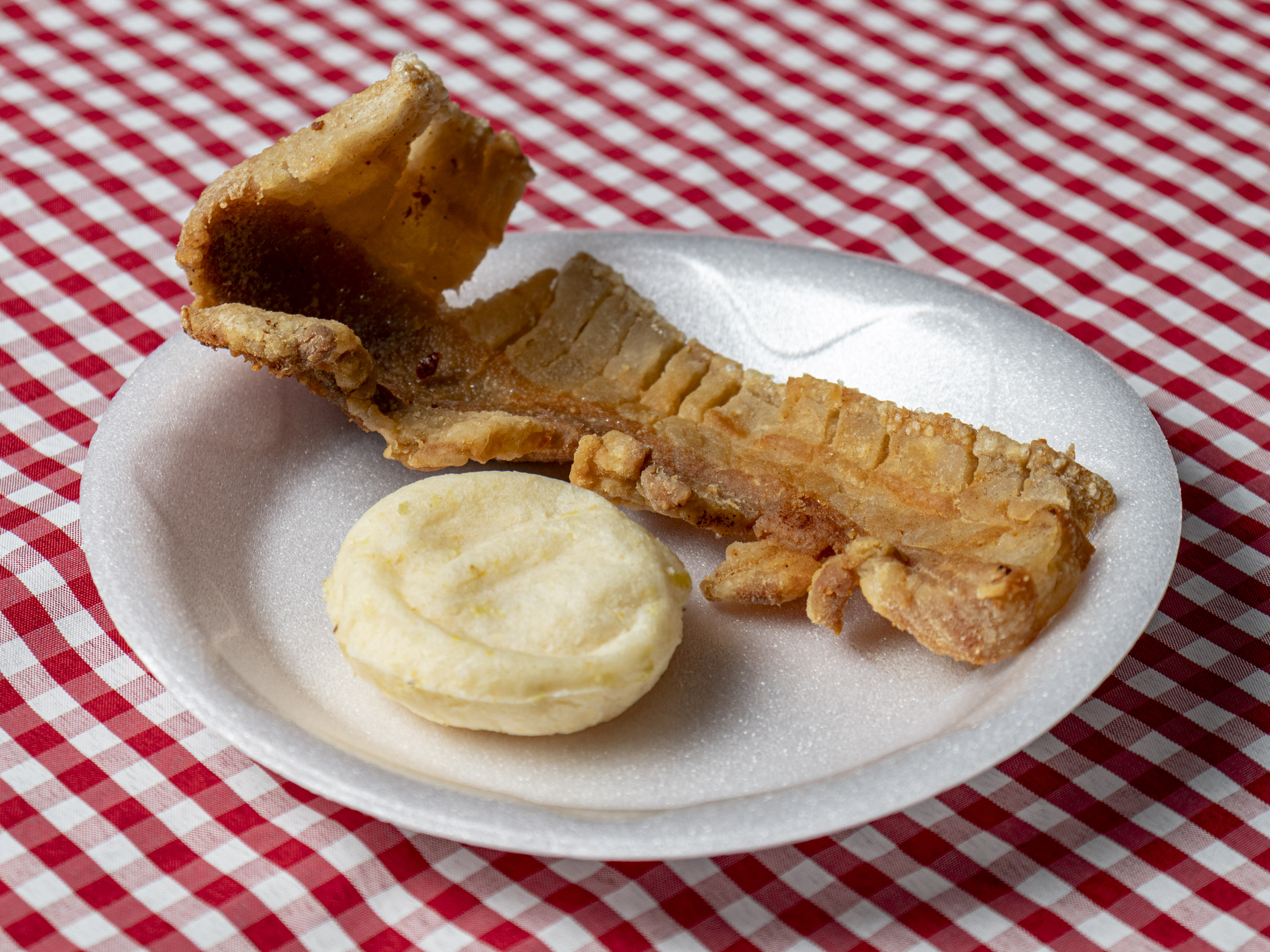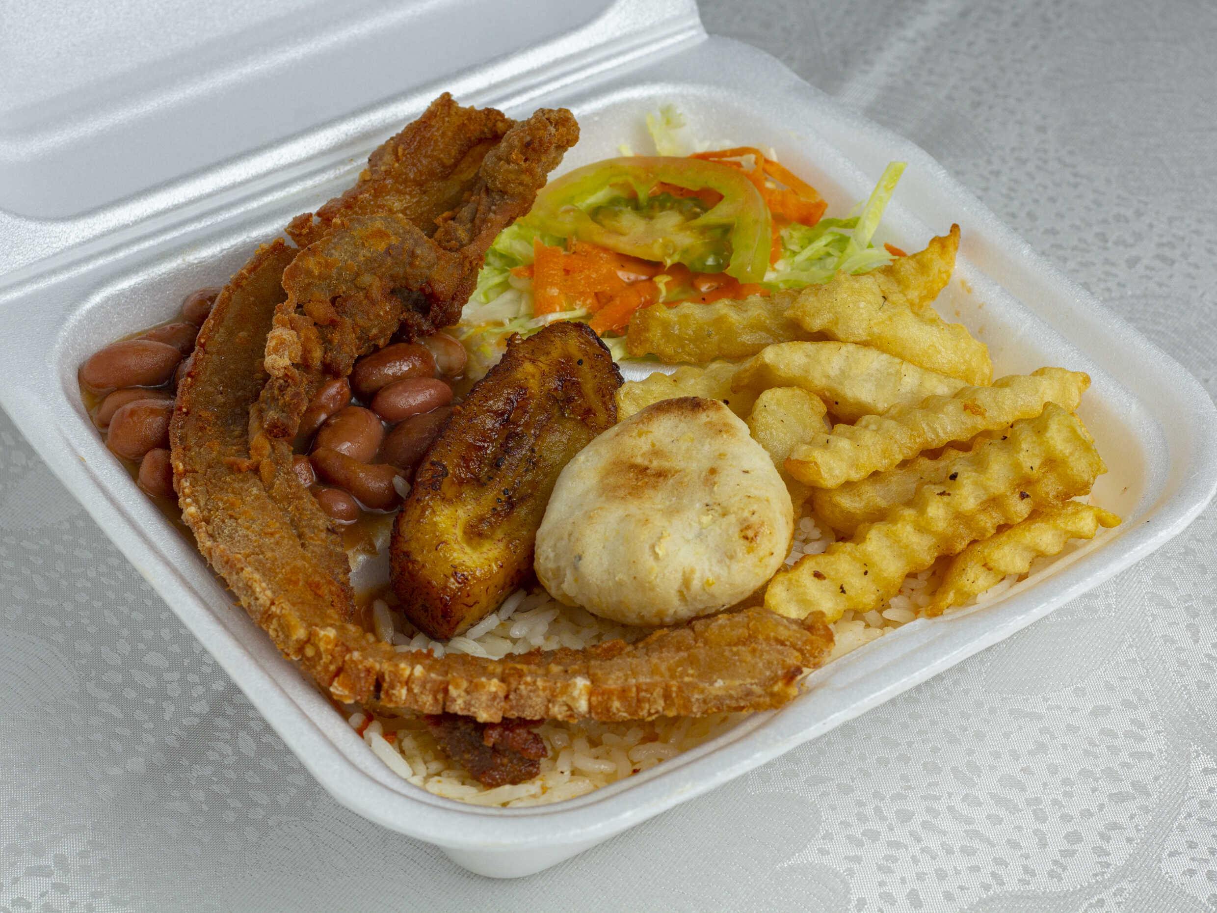 Ejecutivo con chicharrón de 130gr, arroz, frijoles en la bandeja, ensalada de la casa, arepa asada, papas a la francesas, acompañado de sopa del dia y jugo del dia. (porcion personal)