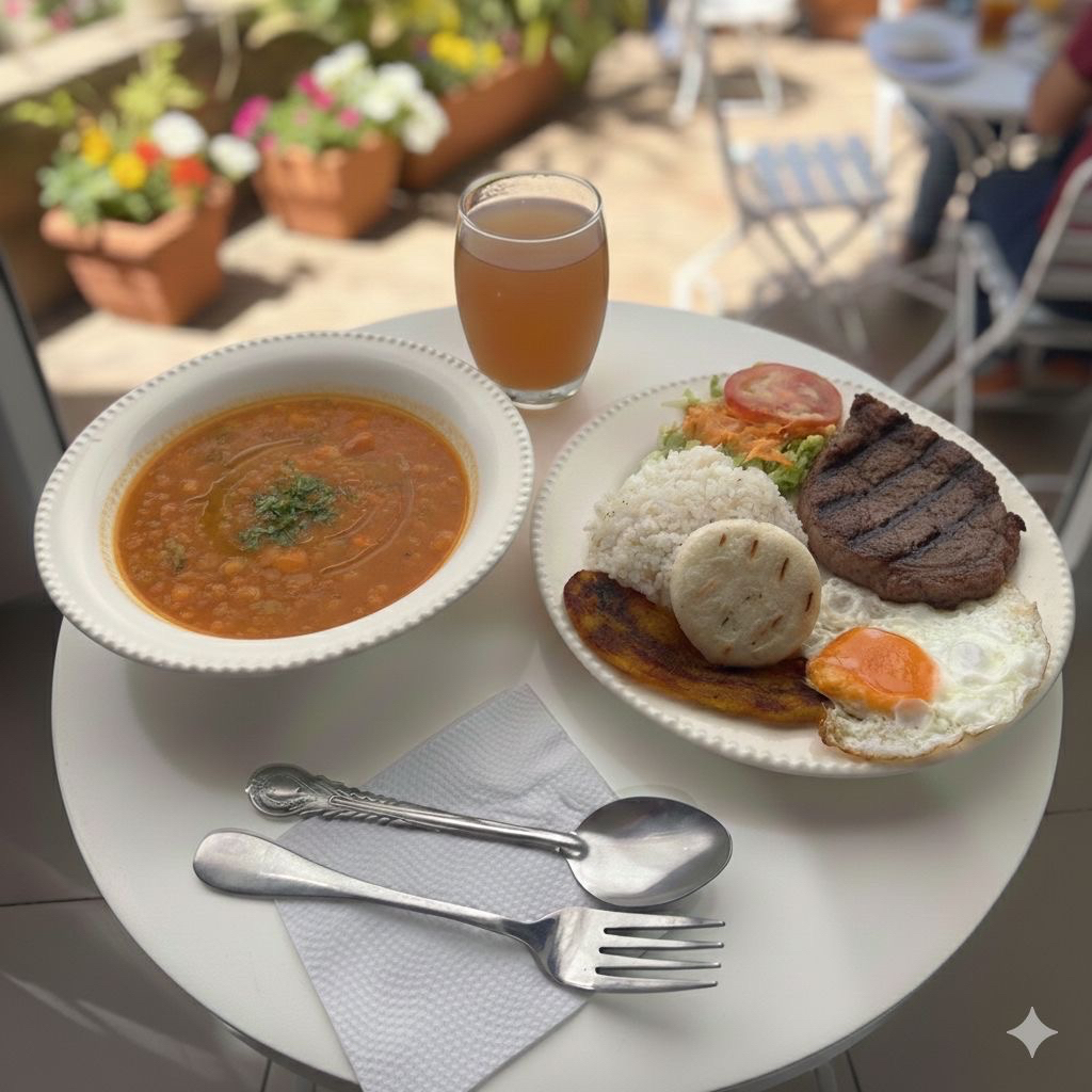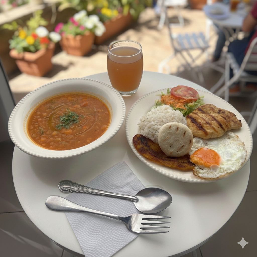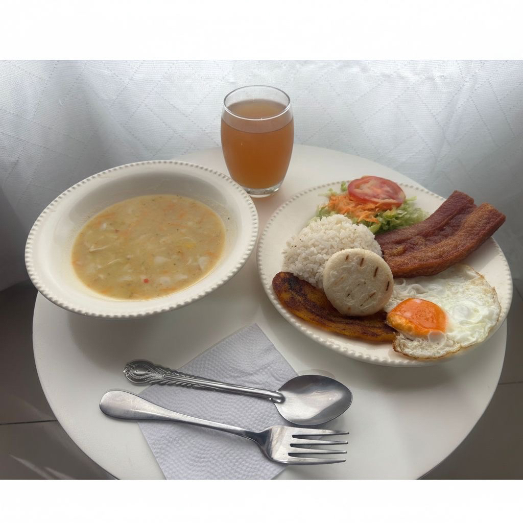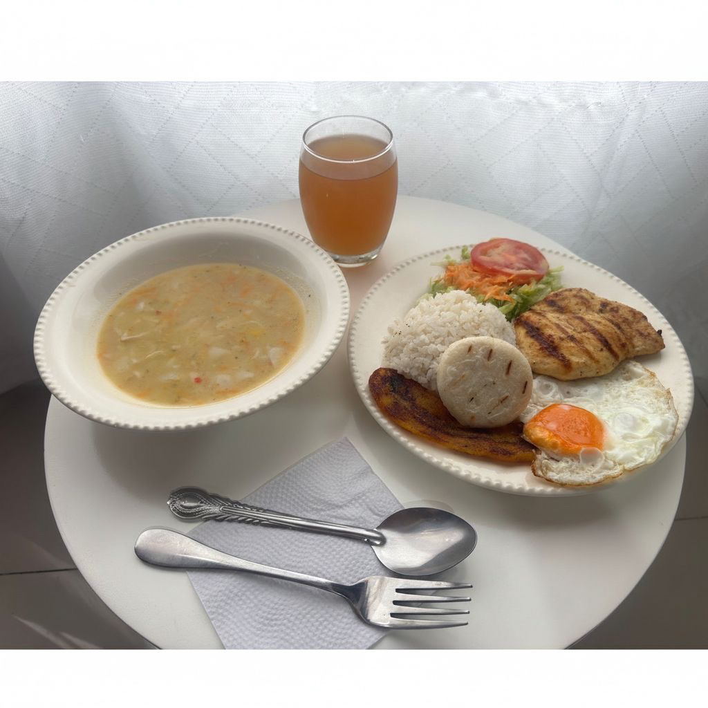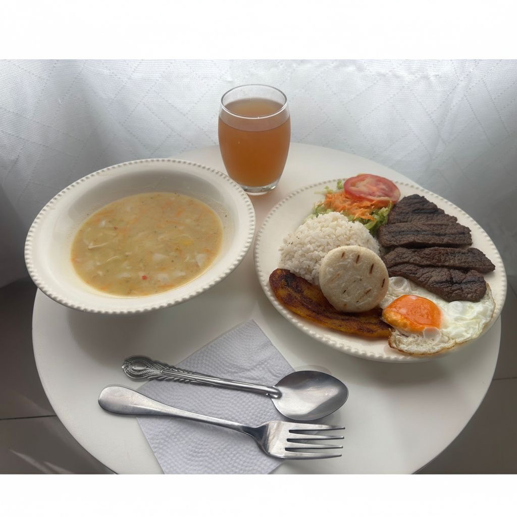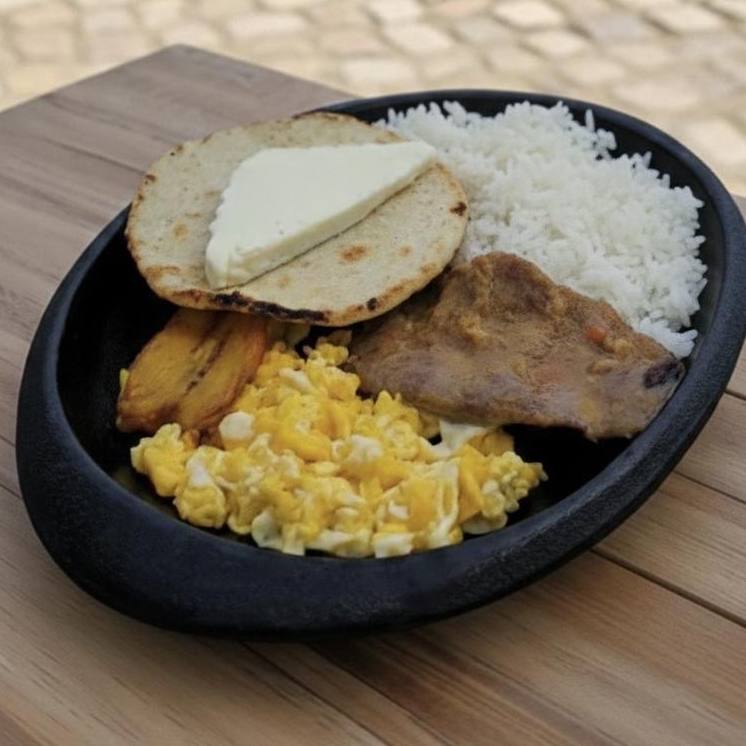 Arroz, Carne, Huevo, Tajada, Arepa, Ensalada