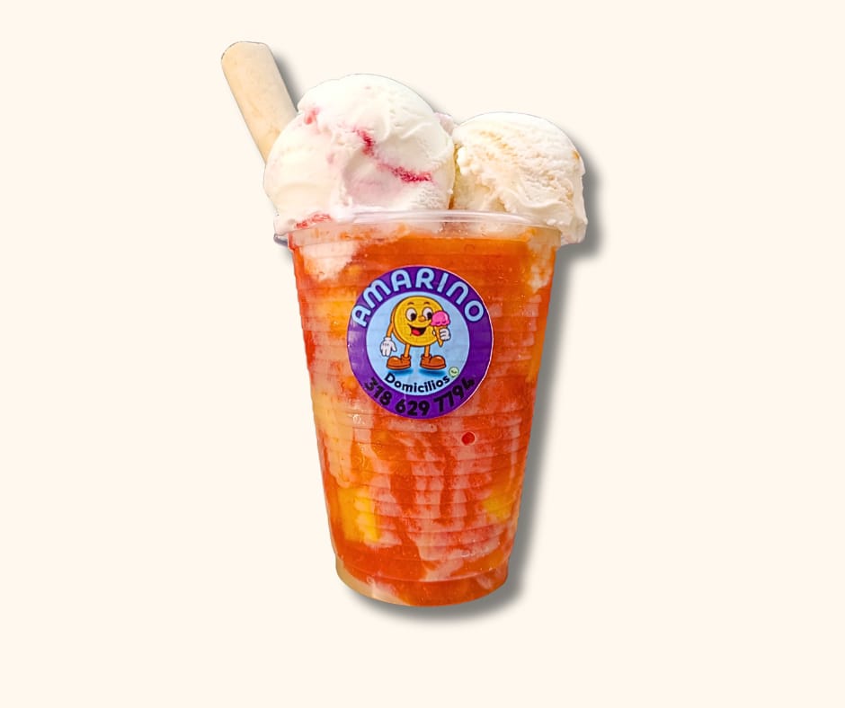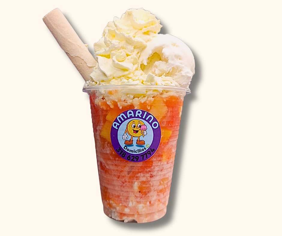 Deliciosa combinación de frutas picadas (mango, manzana, papaya, banano) acompañado de un sabor de helado chantilly de la casa queso rallado salsa y barquillo 14 oz.