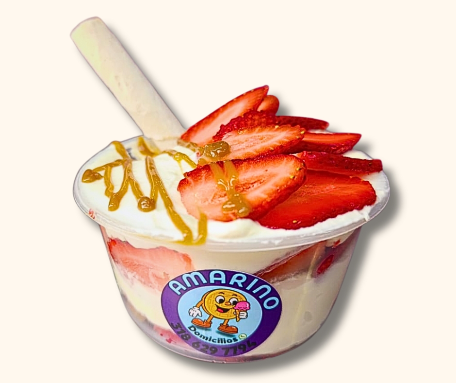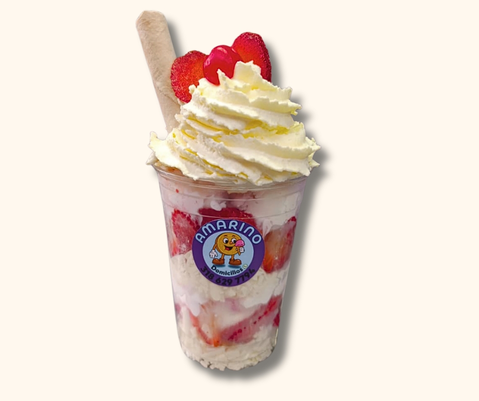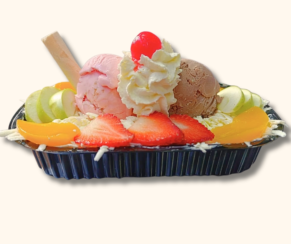 Dos sabores de helado, con delicioso queso rallado, crema de la casa deliciosa y cremosa (la misma que contiene las fresas con crema), acompañada de fruta fresca (fresa, mango, papaya, durazno, banano, manzana) chantilly, cereza y salsa.