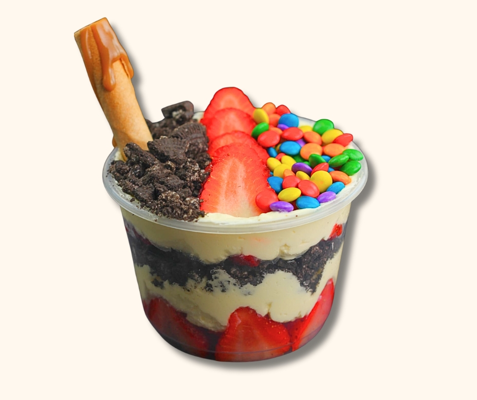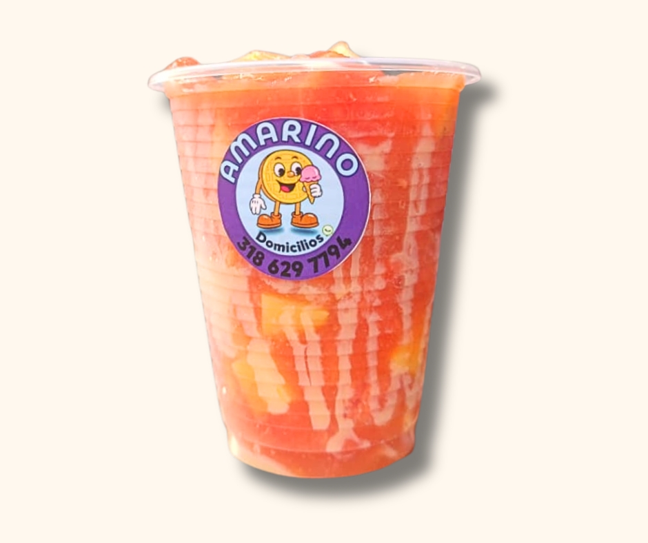 Deliciosa ensalada de frutas en tamaño personal con queso rallado, crema de la casa, un sabor de helado, chantilly, salsa y las siguientes frutas(fresa, durazno, papaya, mango, manzana, banano y cereza