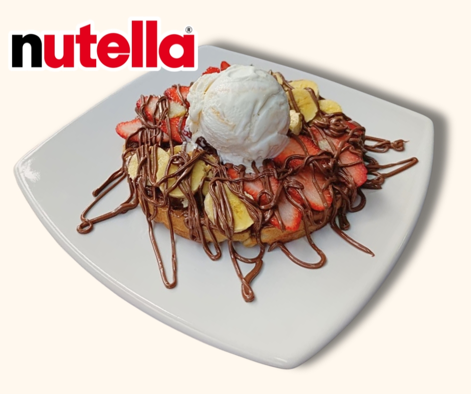 Waffle dorado y bien horneado, Nutella original, un sabor de helado, fresa fresca, banano.