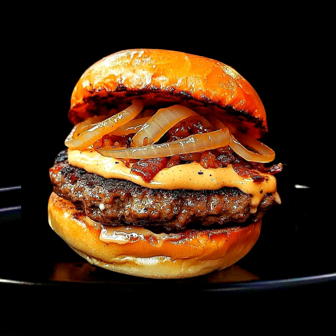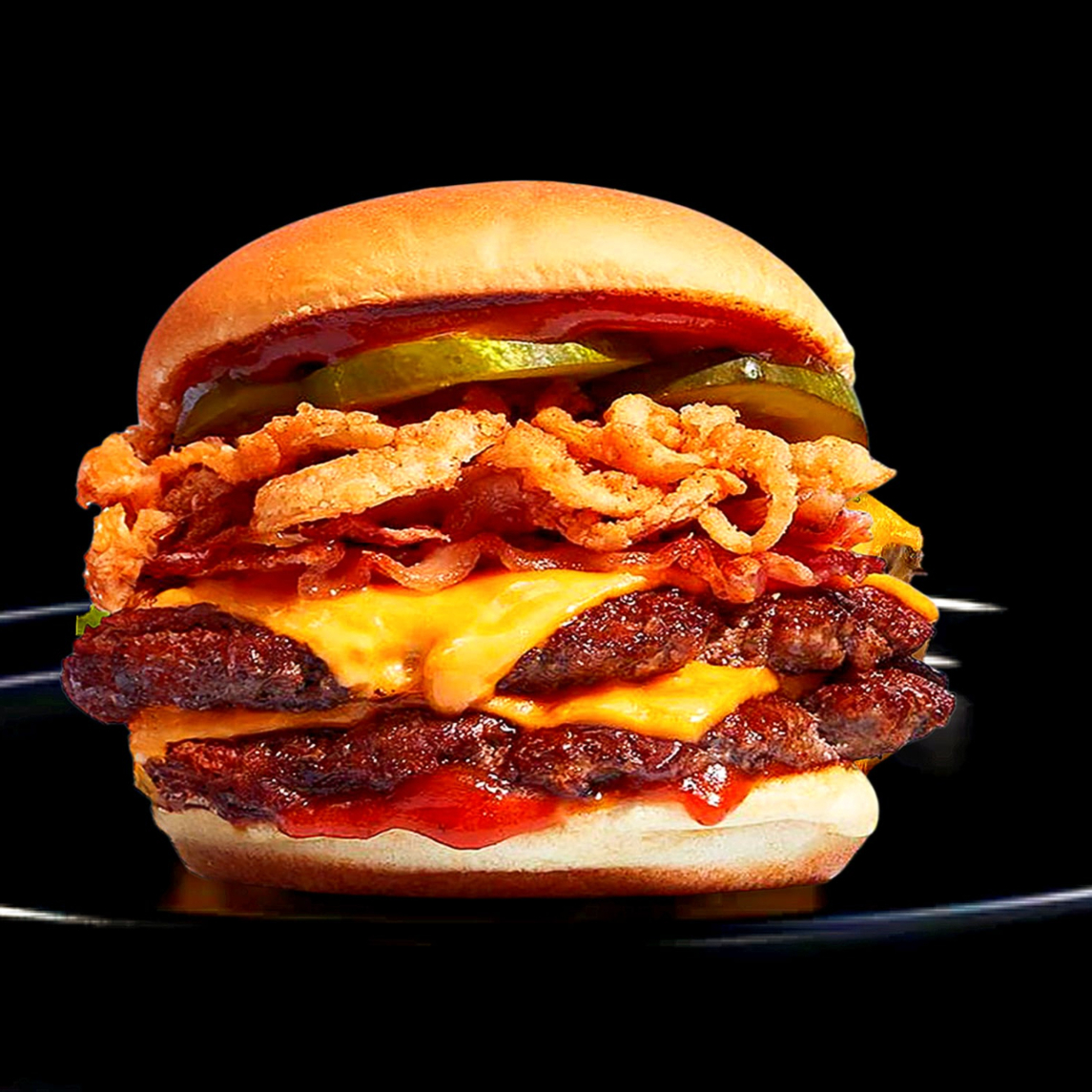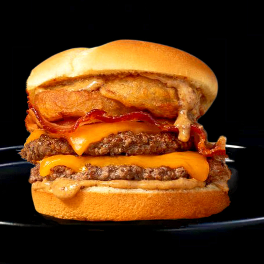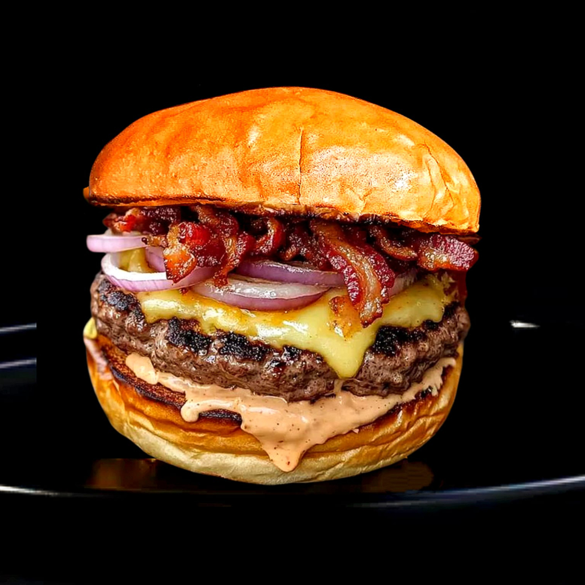Pan artesanal, doble carne de res, Aros de Cebolla, doble queso cheddar, pepinillos y mayomostaza.