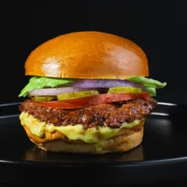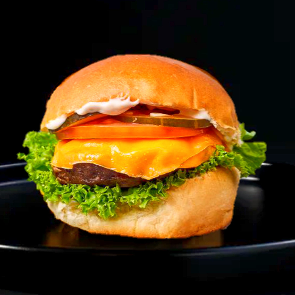 Pan artesanal, Doble carne de res, Queso cheddar, lechuga, Tomate, Cebolla morada y pepinillos