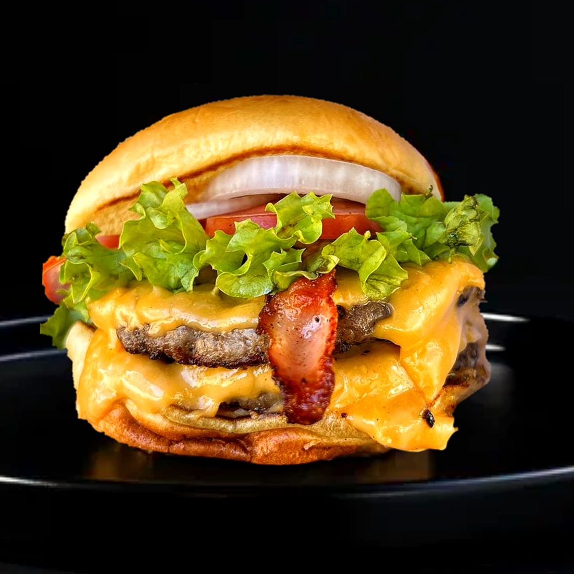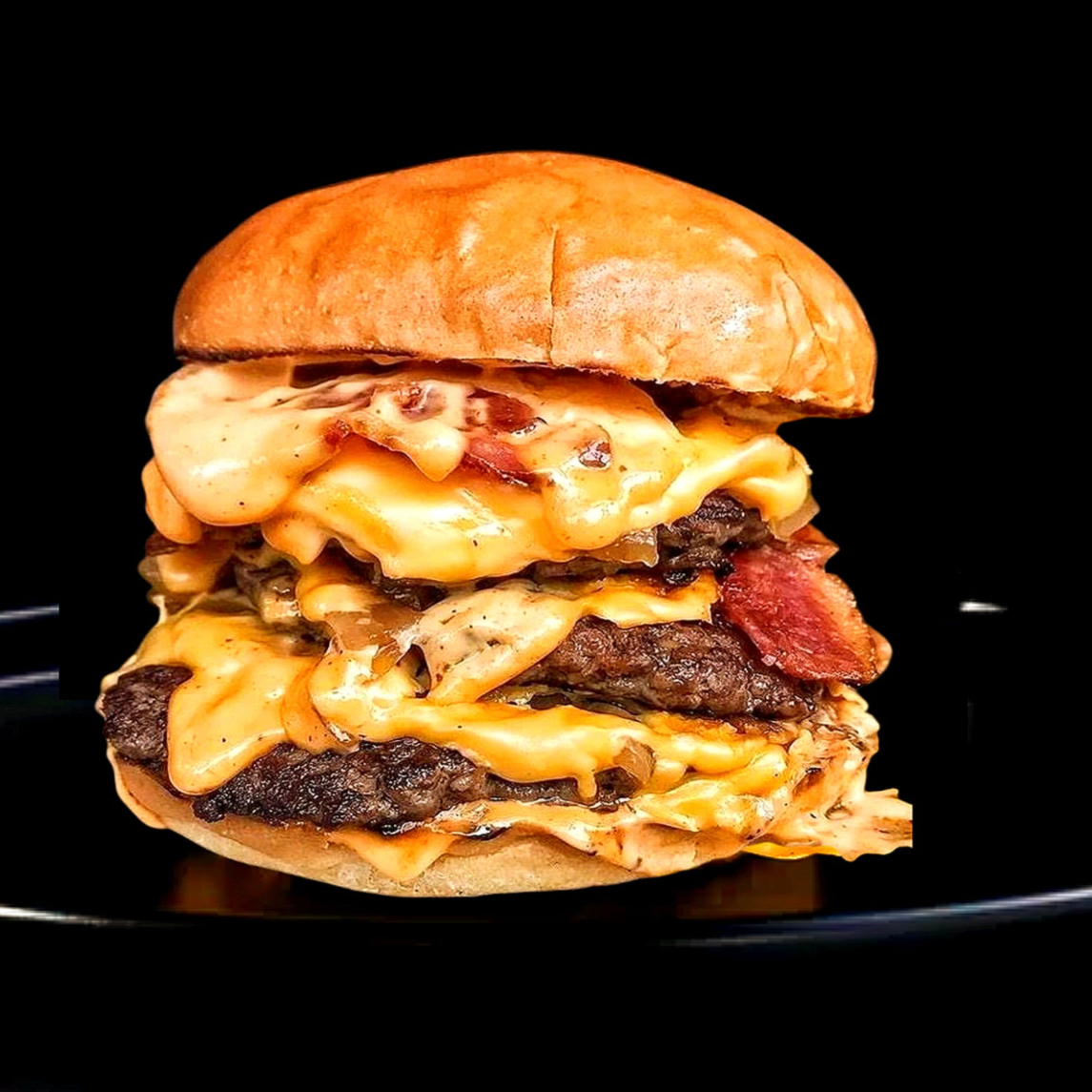 Pan artesanal, Triple carne de res, triple tocineta, queso cheddar y pepinillos.