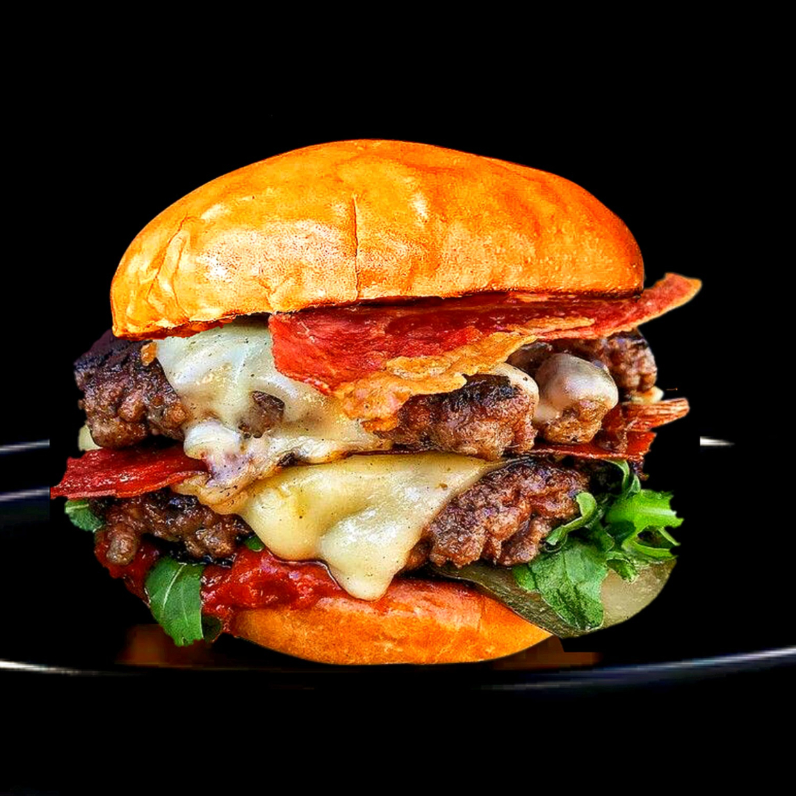 Pan artesanal, doble carne de res, doble tocineta, queso Mozzarella y pepinillos.