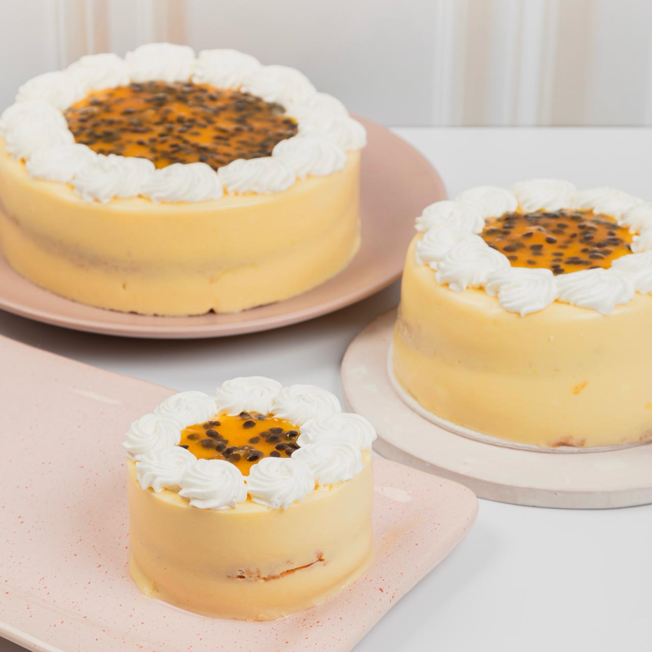 Delicioso mousse de maracuyá separado por dos capas de bizcochuelo humedecido con tres leches sabor a maracuyá. decorado con una rica y natural salsa de maracuyá. tamaño: 14,5 cms: 6- 8 porciones.