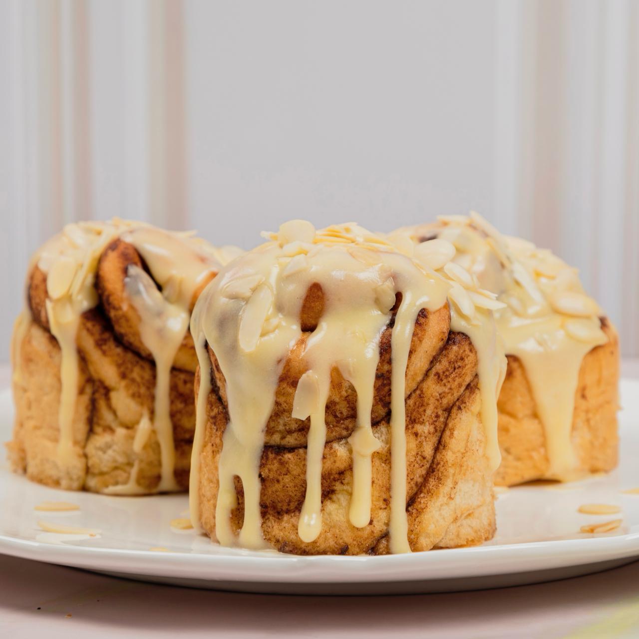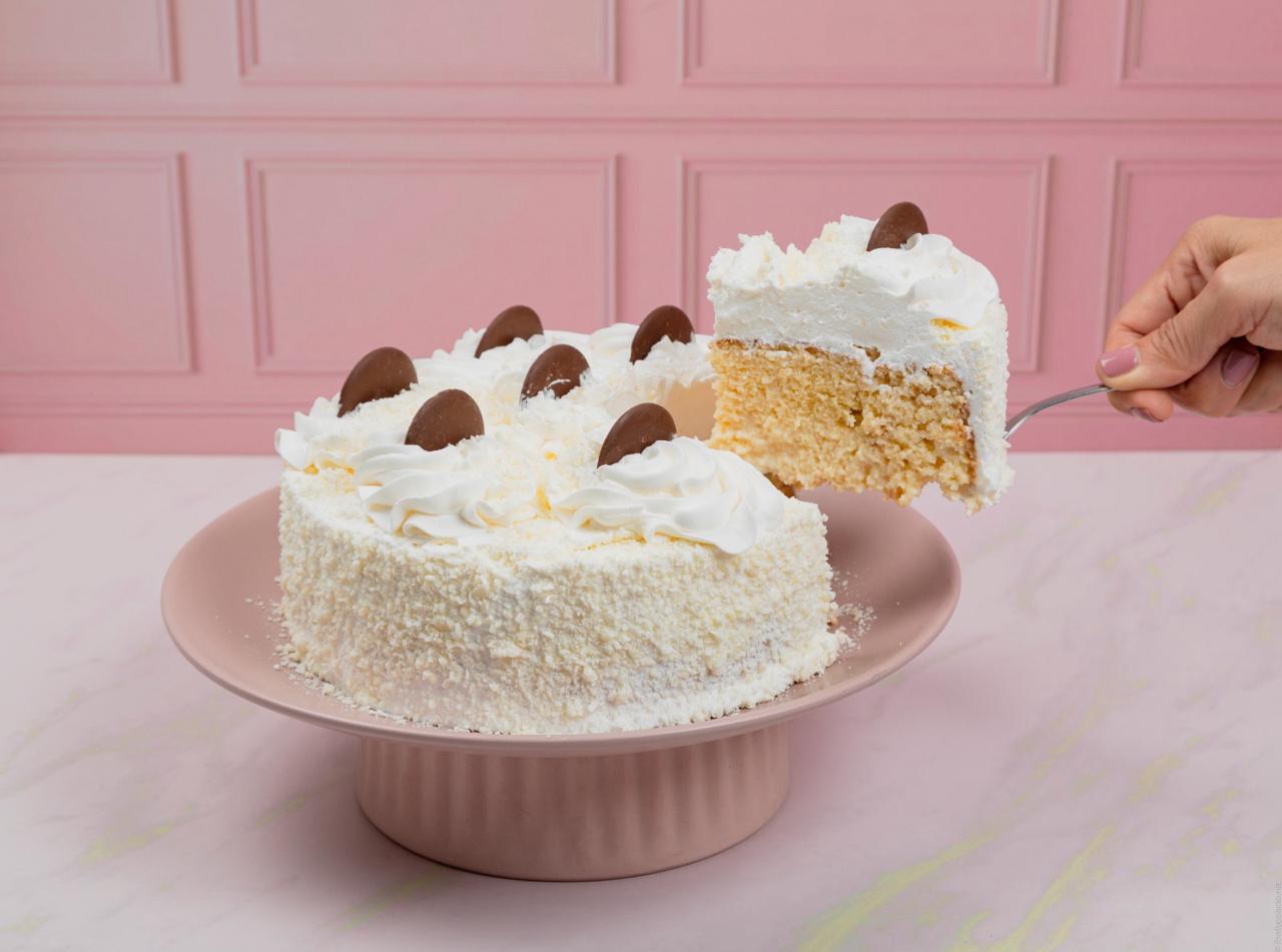 Bizcochuelo bañado en mezcla de leche entera, crema de leche, leche condensada cubierta con crema de vainilla y chocolate blanco, 16 porciones.
