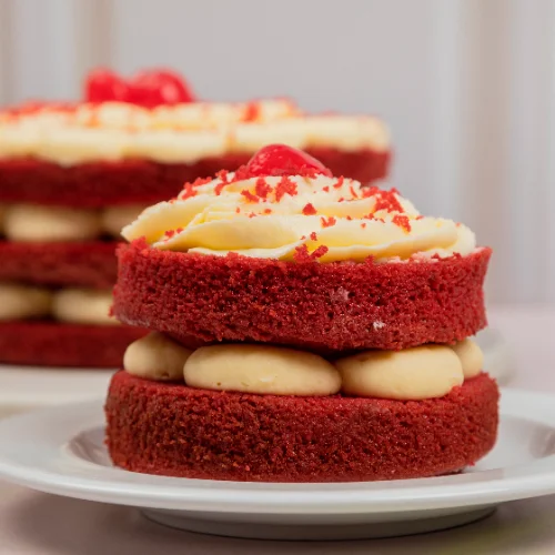 Tradicional y esponjosa torta americana, con finas capas de crema hechas con queso crema y chocolate.tamaño 9 cms alto 5 cms 1-2 porciones.