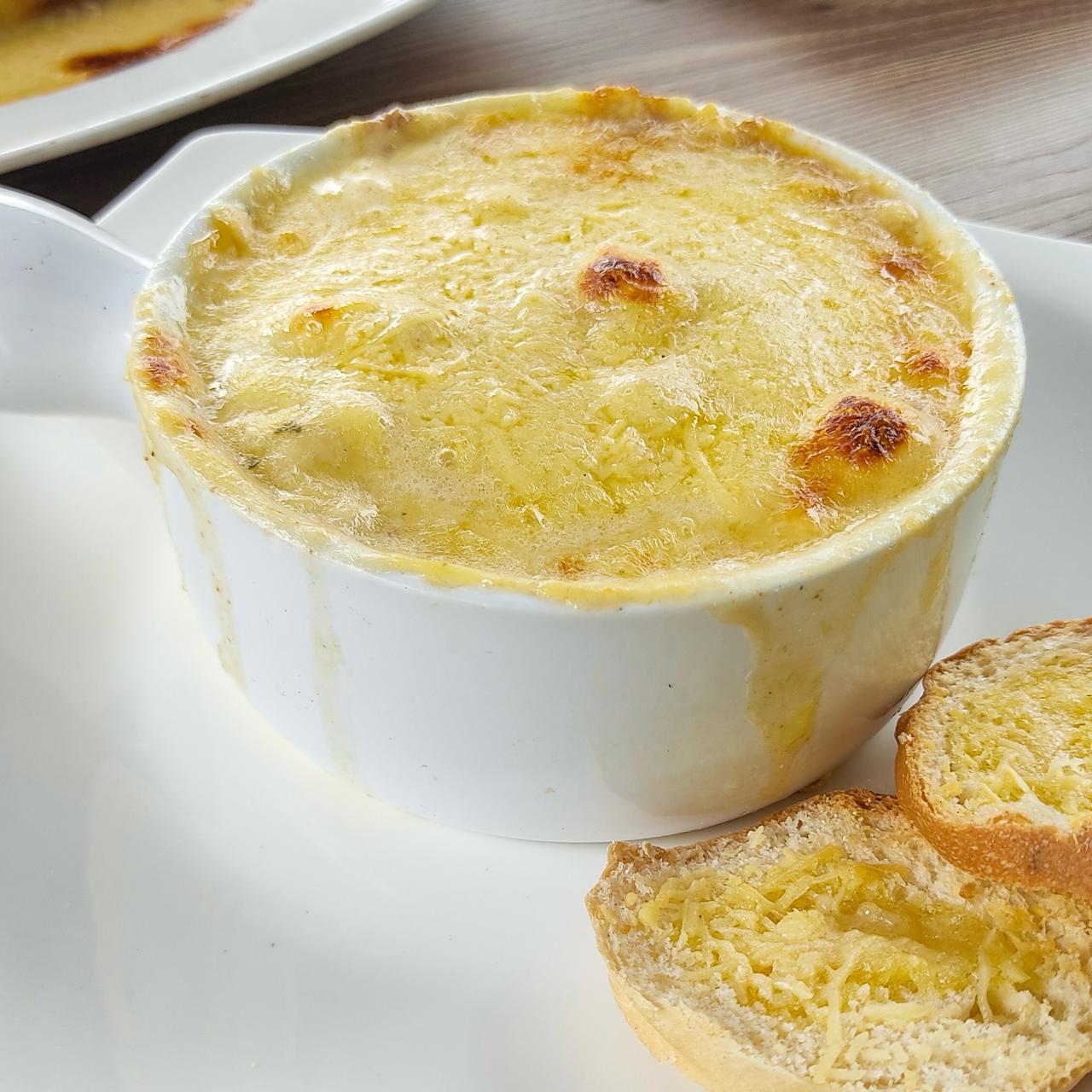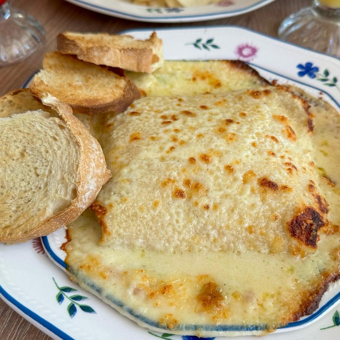 Tortilla de maíz con pollo en salsa bechamel, queso mozzarella y pan tostado.