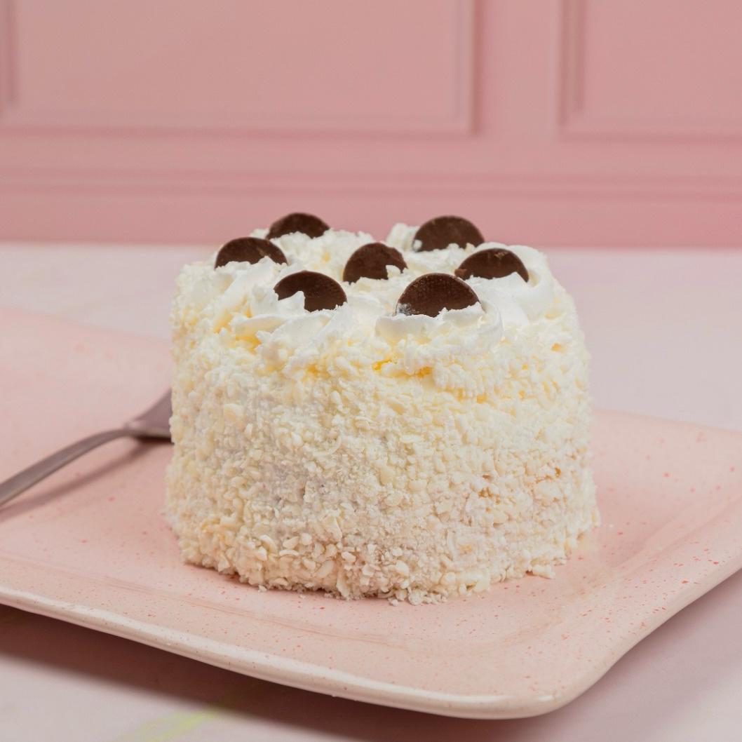 Bizcochuelo bañado en mezcla leche entera, crema de leche, leche condensada cubierta con crema de vainilla y chocolate blanco, 2 porciones.