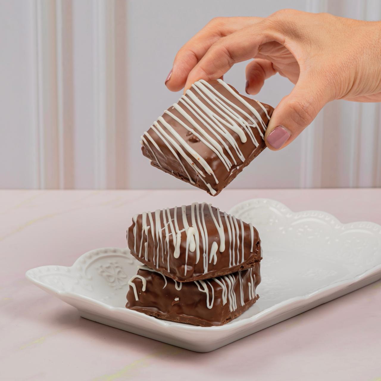 Bizcochuelo bañado en mezcla de leche entera, crema de leche, leche condensada con sabor a whisky, cubierta de crema fría y chocolate, 16 porciones.