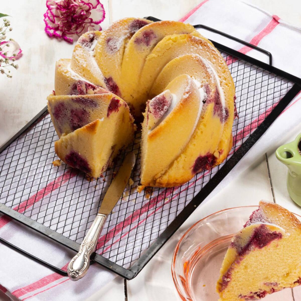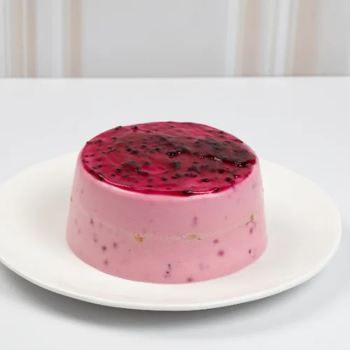 Bizcochuelo humedecido con dulce jarabe de la casa sabor vainilla y bañado en salsa de mora, 8 porciones.