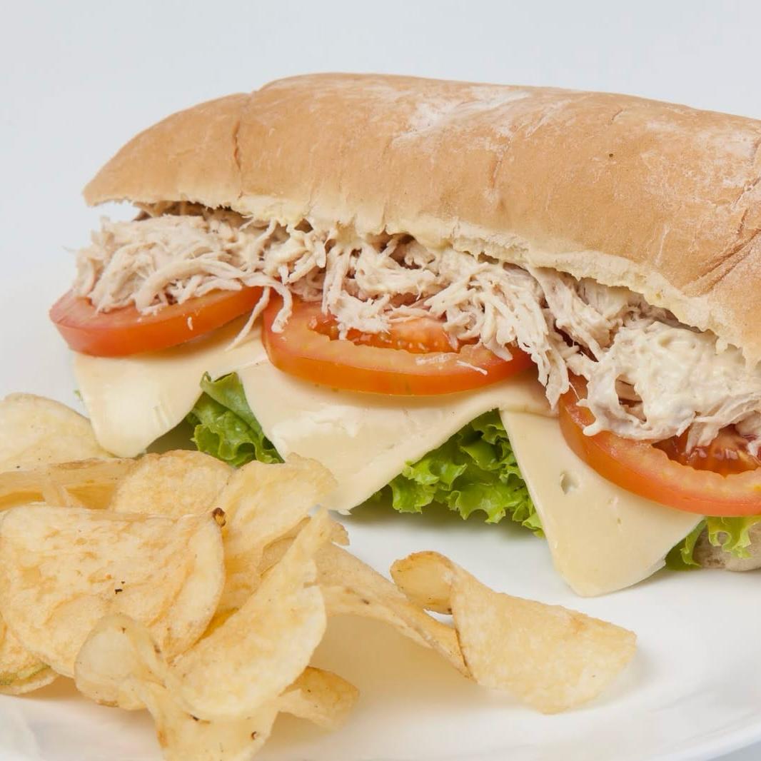 Pan artellano, salsa alfredo, tomate, lechuga crespa, pollo desmechado, queso mozzarella.