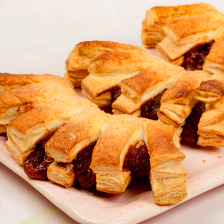 Omelette de dos huevos, jamón y queso mozzarella más rollo cuatro quesos o el hojaldrado que elijas.