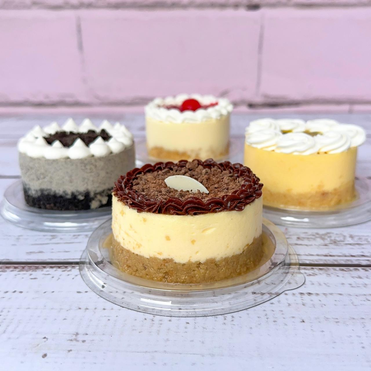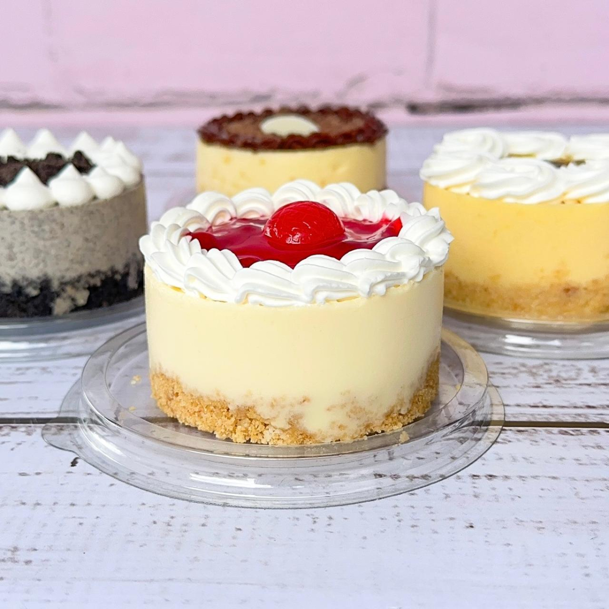 Suave y delicioso postre refrigerado de queso, con base de galleta bañado en salsa demora o fresa.tamaño 9 cms alto 5 cms 1-2 porciones.