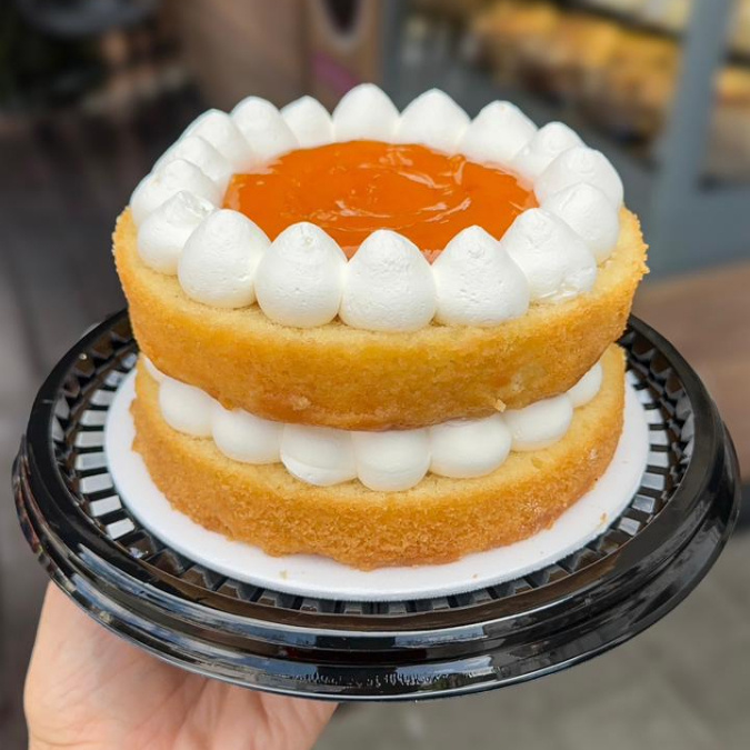 Esponjosa torta de vainilla, humedecida con sirope dulce y rellena de crema fría y durazno.