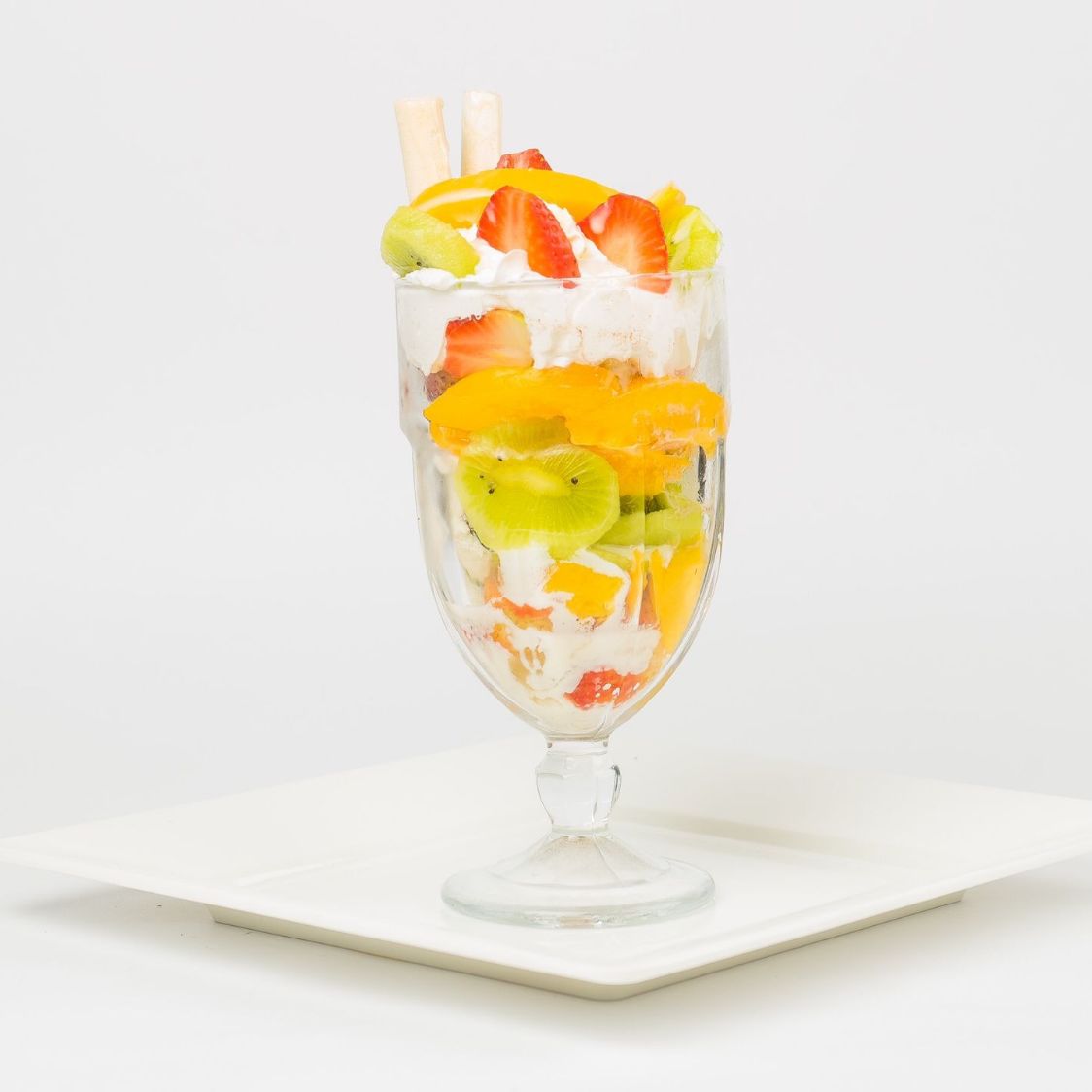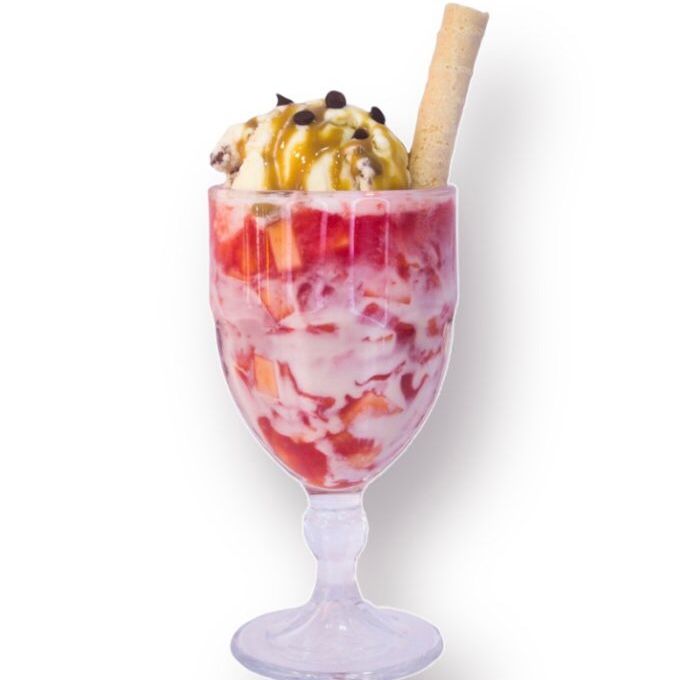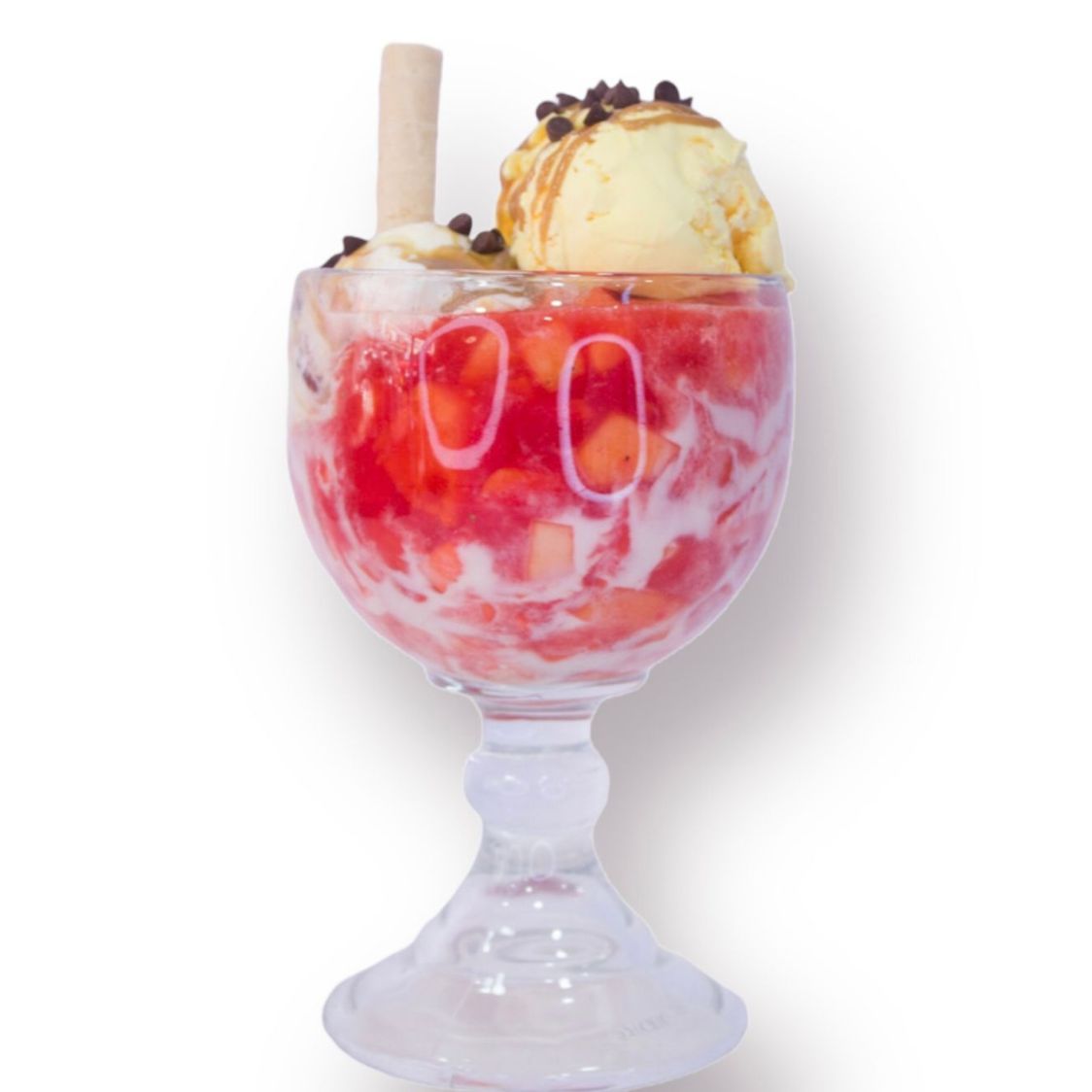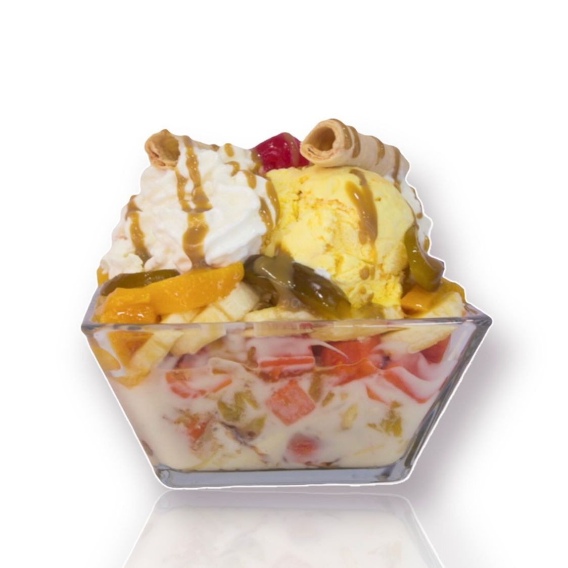 Deliciosa combinación de frutas bañada en yogurt o TRES LECHES con UNA porciones de helado, queso,chantilly,barquillo y salsa, EMPAQUE sello plus 12onz.