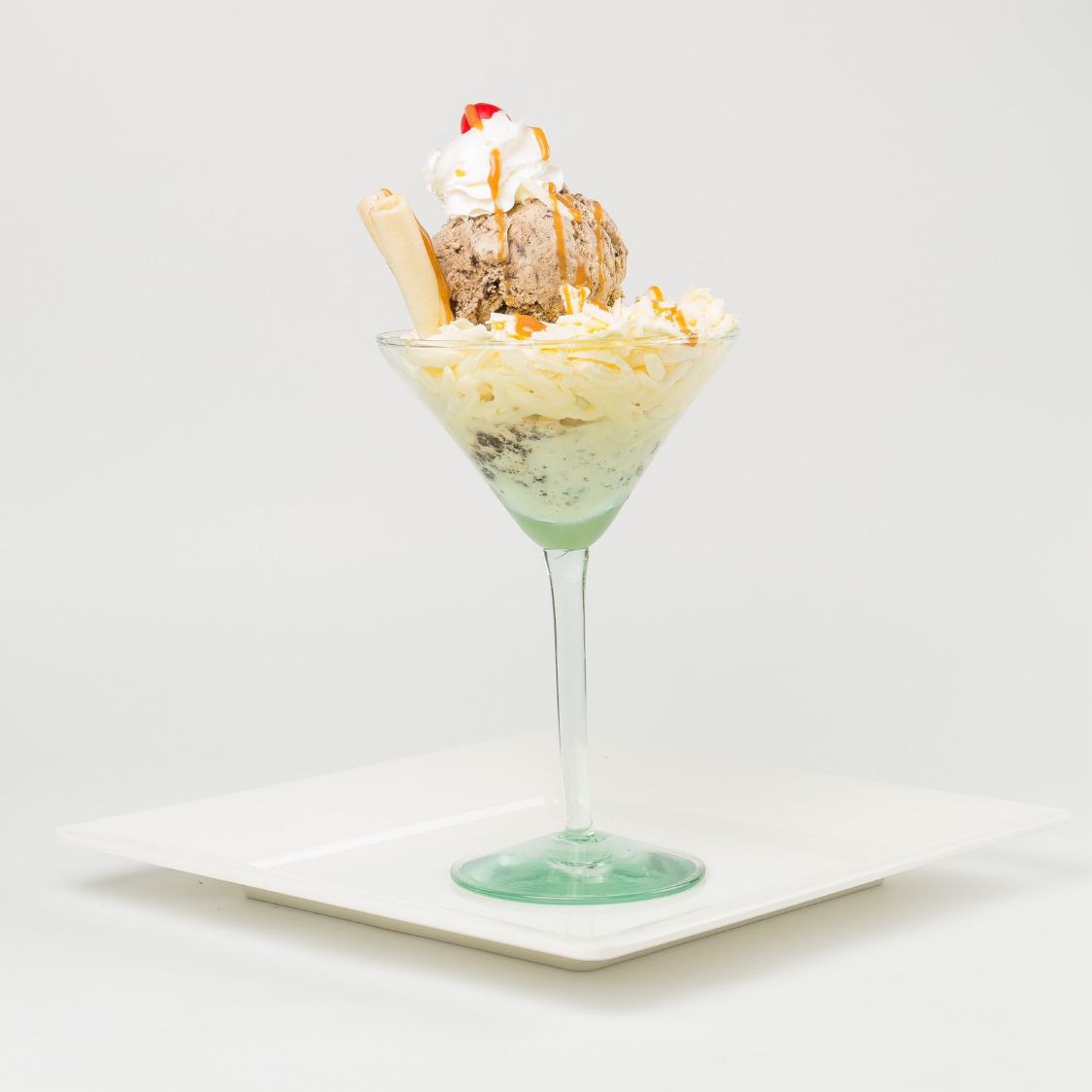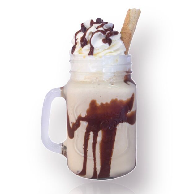 malteada con tu sabor favorito de helado, trozos de brownie, borde de arequipe, chantilly, barquillo, lluvia de chocolate y salsa de preferencia