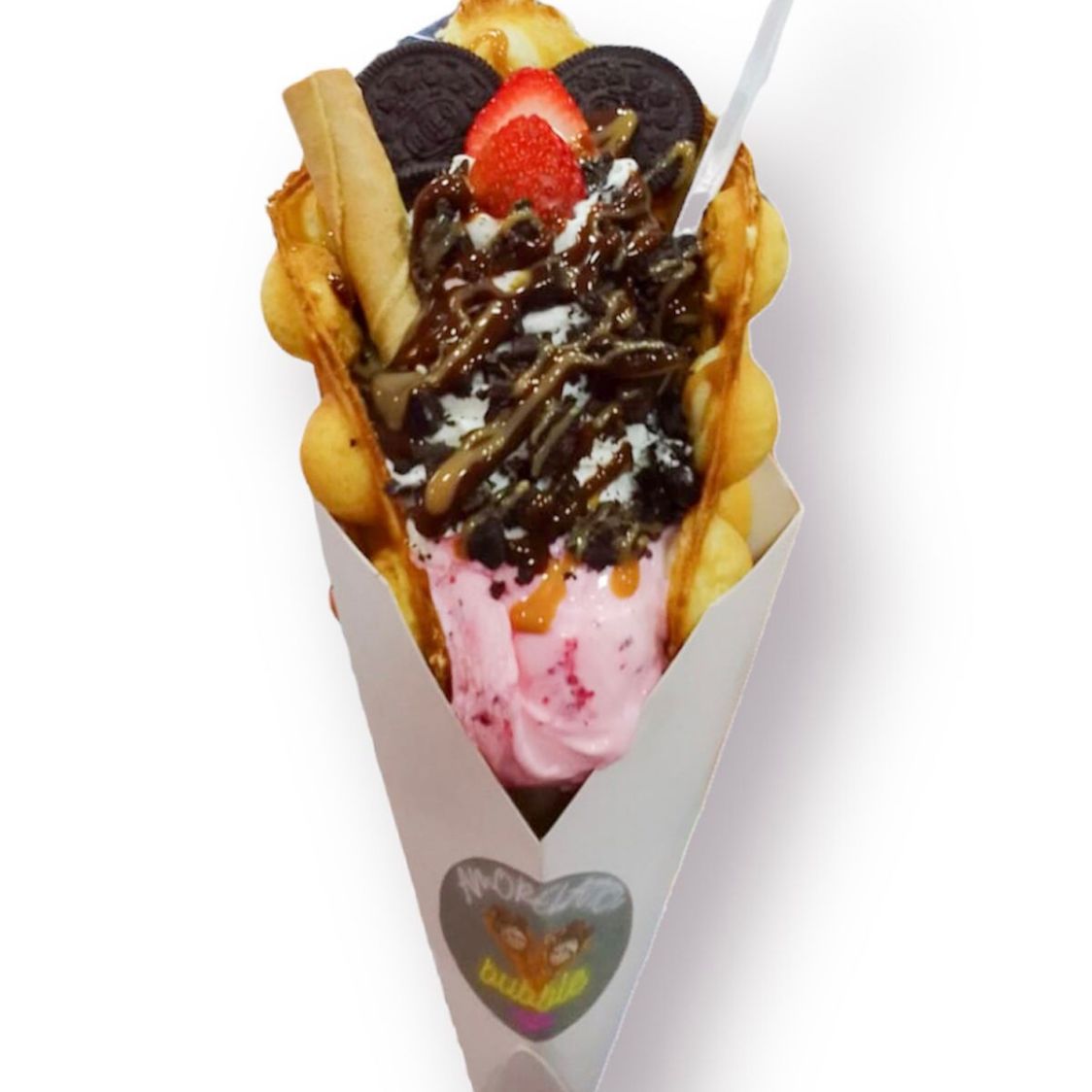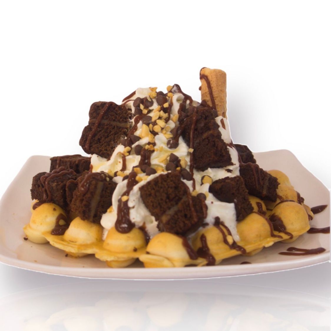 Wafle, Salsa de chocolate y arequipe, oreo, maní, m&m, trozos de brownie, un sabor de Helado y Chantilly