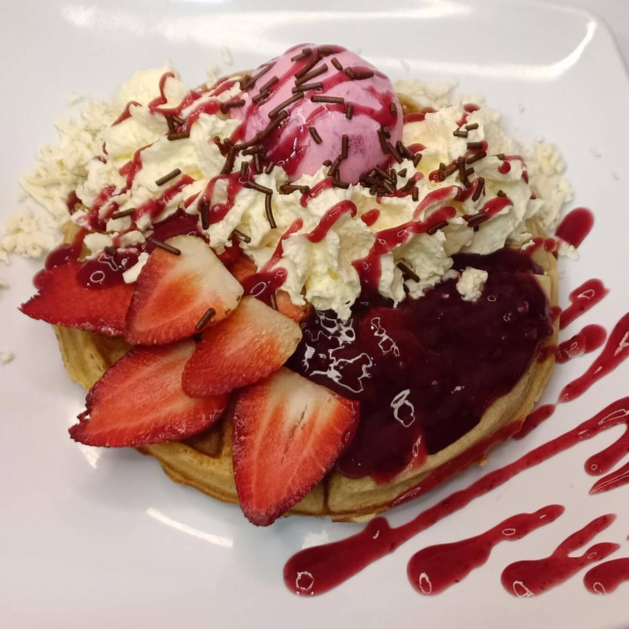 Delicioso Wafle, 1 sabor de helado, fresas, confitado de frutos rojos, queso y Chantilly