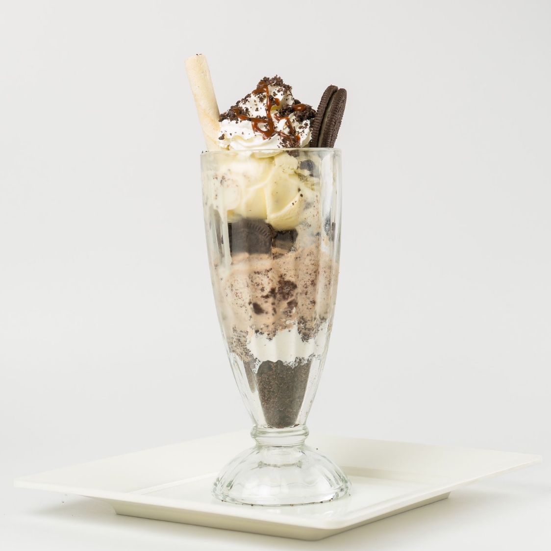 Dos porciones de helado, queso, galleta oreo, barquillo, salsa de preferencia y chantilly.Llegara en la forma disponible