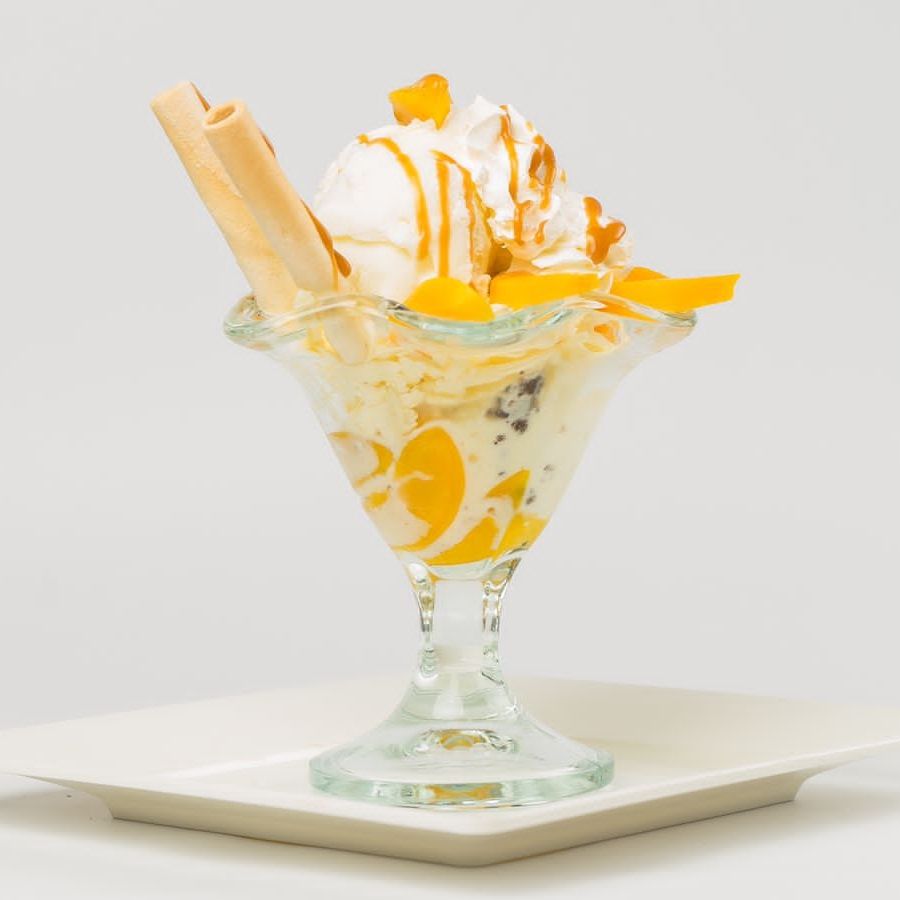 2 sabores de helado Mango, piña, durazno , mermelada de frutos amarillos, Chantilly, barquillo , lluvia de chocolate