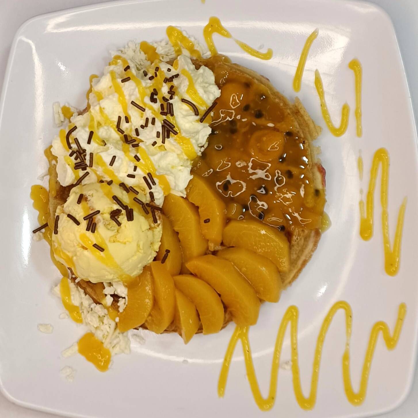Delicioso Wafle,1 sabor de Helado, Duraznos, Confitado de frutos Amarillos, Queso y chantilly