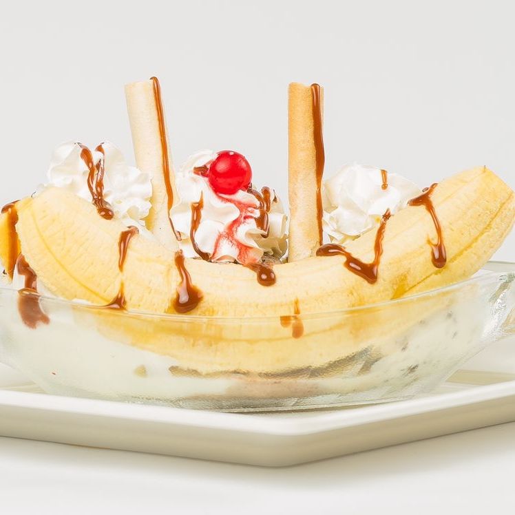 tres bolas de helado, banano, chantilly, barquillo y salsa de preferencia