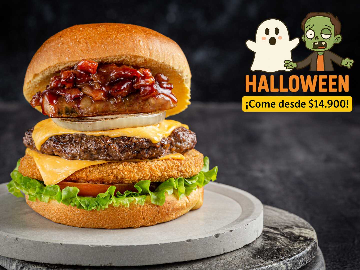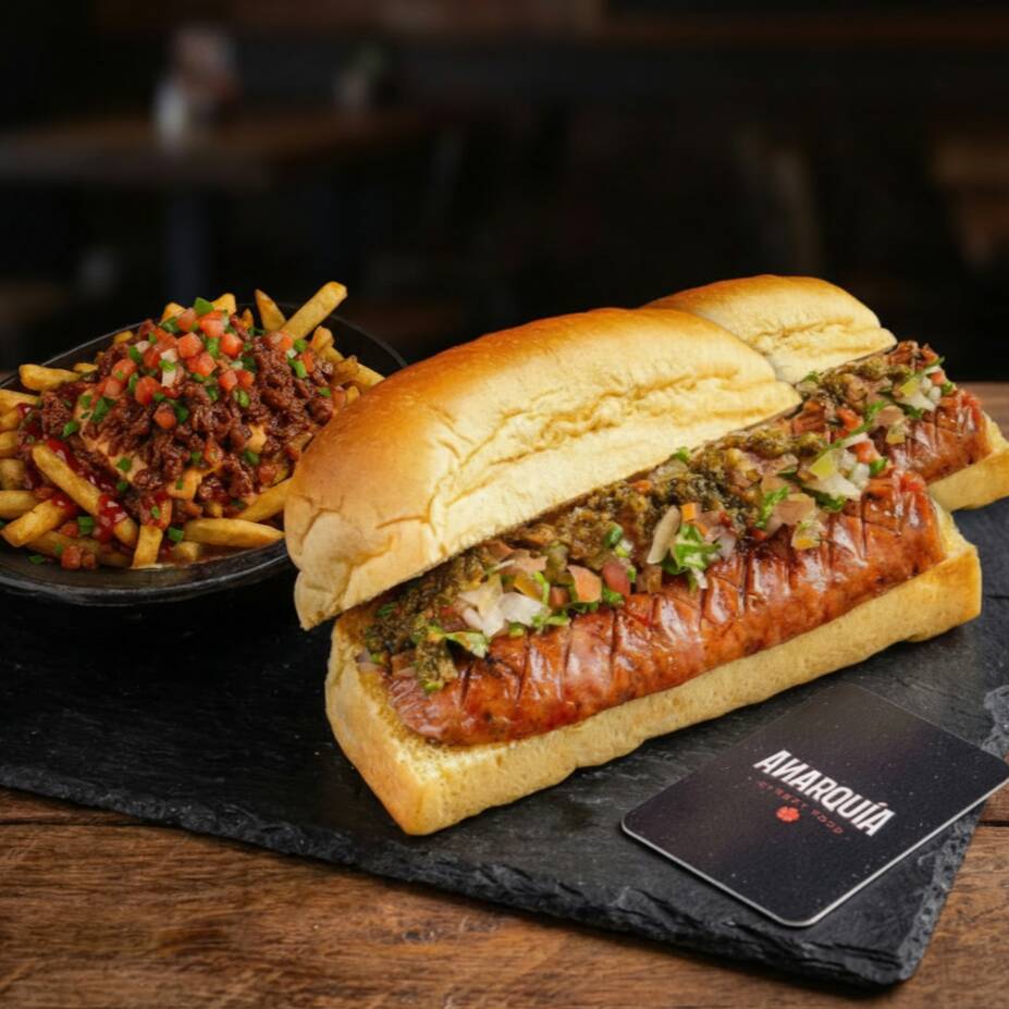 Pan brioche, cogollo europeo, tomate, salsa anarquía, pollo apanado, queso cheddar, carne de res, queso cheddar, chorizo argentino, cebolla a la plancha, crispy bacon bbq.