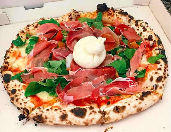 "(Salsa de tomate, mozzarella, rugula, jamon serrano, tomate cherry, burrata) (Tomato sauce, mozzarella, arugula, serrano ham, cherry tomato, burrata)"