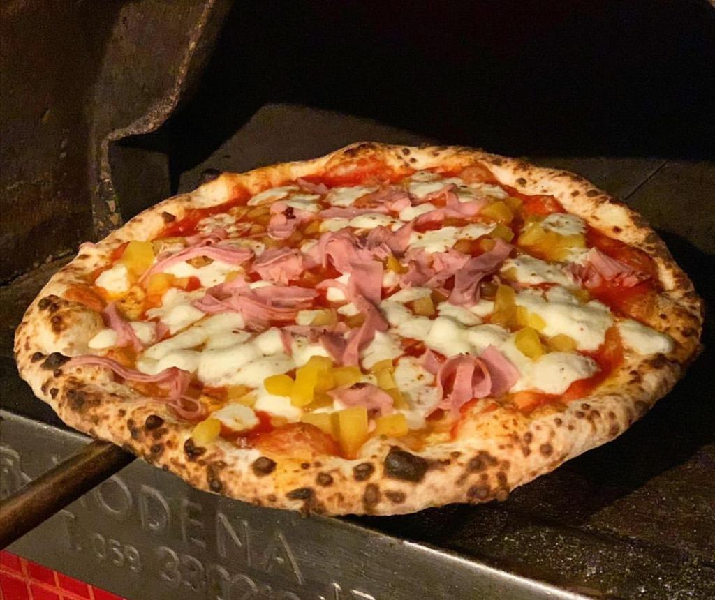 "(Salsa de tomate, mozzarella, jamón, piña) (Tomato sauce, mozzarella, ham, pineapple)"