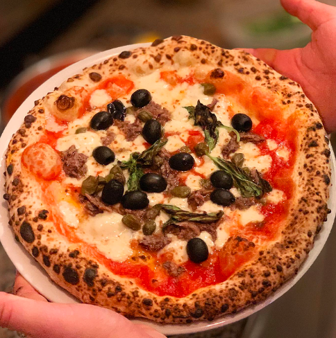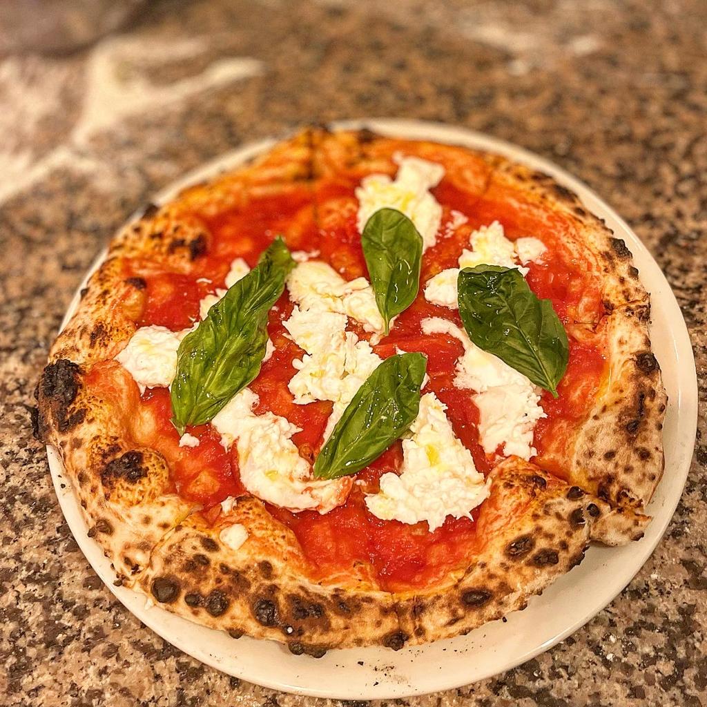 "(Salsa de tomate, stracciatella y albahaca fresca) (Tomato sauce, burrata, fresh basil)"