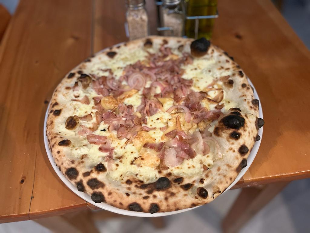 "(mozzarella, provola ahumada, tocienta, cebolla roja, pimienta) (mozzarella, provola, bacon, red onion, pepper)"