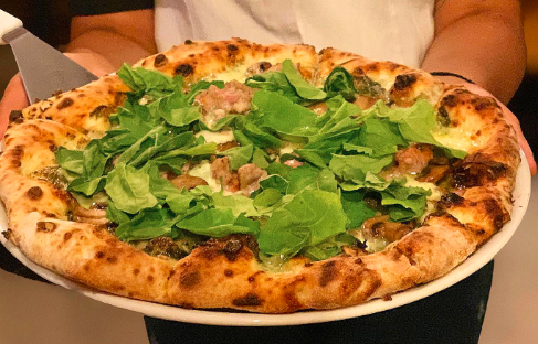 "(mozzarella, queso azul, provola, champiñones, salchicha italiana, rugula, toque de pesto) (mozzarella, blue cheese, provola, mushrooms, Italian sausage, arugula,pesto)"